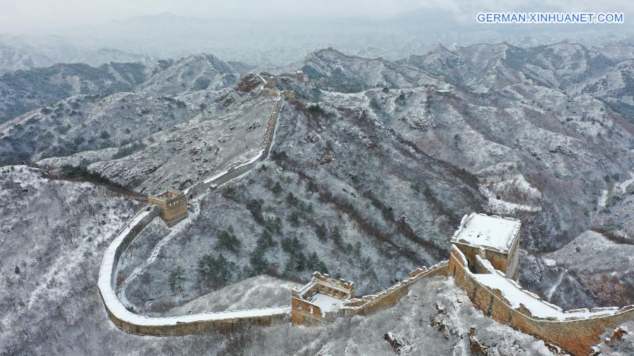 LUANPING, 19. November 2020 (Xinhuanet) -- Das am 19. November 2020 aufgenommene Luftbild zeigt die Schneeansicht des Jinshanling-Abschnitts der Chinesischen Mauer im Kreis Luanping in der nordchinesischen Provinz Hebei. (Quelle: Xinhua/Zhou Wanping)