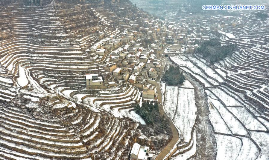 HANDAN, 2. Dezember 2020 (Xinhuanet) -- Das am 2. Dezember 2020 aufgenommene Luftbild zeigt eine Ansicht von schneebedeckten Terrassenfeldern im Kreis Shexian in Handan, der nordchinesischen Provinz Hebei. (Quelle: Xinhua/Wang Xiao)