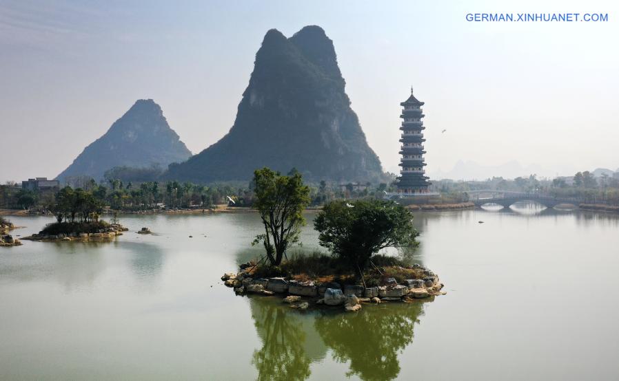 LIUZHOU, 5. Januar 2021 (Xinhuanet) -- Reiher fliegen über einen See im Bagongtang-Feuchtgebietspark im Bezirk Liujiang von Liuzhou, dem südchinesischen Autonomen Gebiet Guangxi der Zhuang, 4. Januar 2021. Der Bagongtang-Feuchtgebietspark wird zu einem beliebten Ort für die Bürger, um sich zu entspannen, da das ökologische Rehabilitationsprojekt kürzlich abgeschlossen wurde. Mit einer Fläche von über 1.600 mu (ca. 106,7 ha) ist der Feuchtgebietspark ein ökologischer Komplex für die Bürger, um Besichtigungstour zu machen und sich zu entspannen. (Quelle: Xinhua/Li Hanchi)