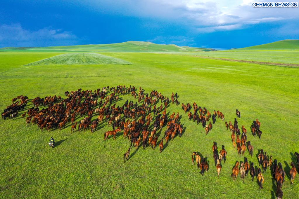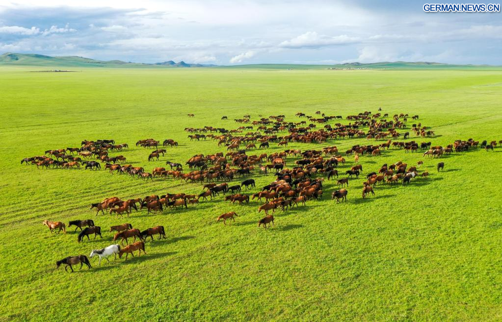 TONGLIAO, 6. Juli 2023 (Xinhuanet) -- Dieses am 5. Juli 2023 aufgenommene Luftbild zeigt Pferde, die auf dem Grasland in Holin Gol des nordchinesischen Autonomen Gebiets Innere Mongolei laufen. Das malerische Grasland in Holin Gol, das an der Kreuzung von Horqin Grassland, Xilin Gol Grassland und Hulunbuir Grassland liegt, ist eines der ursprünglichsten Grasländer des Autonomen Gebiets Innere Mongolei. (Quelle: Xinhua/Lian Zhen)