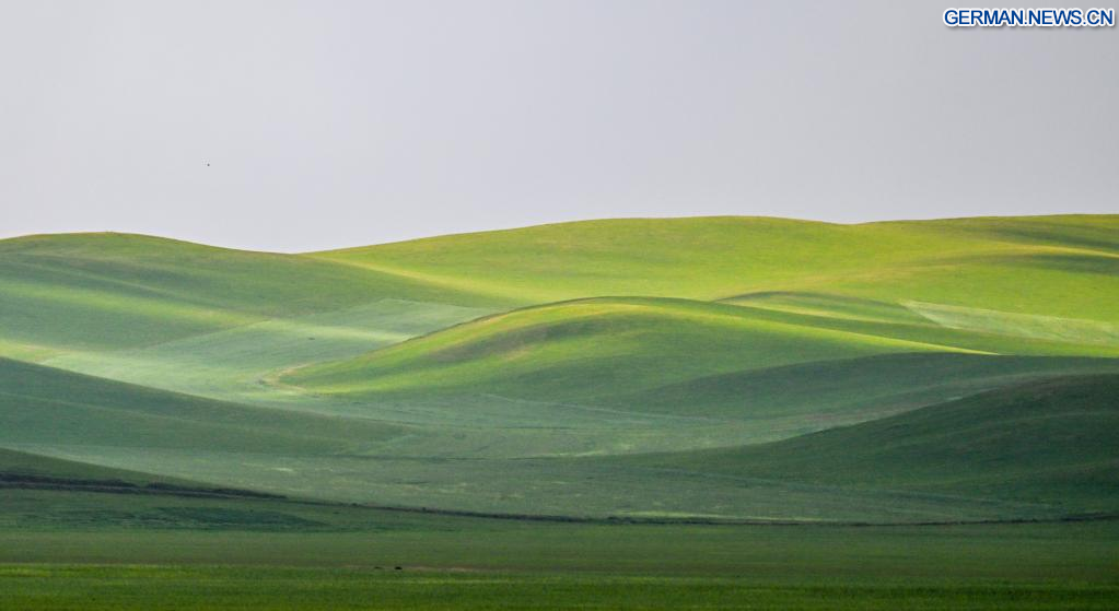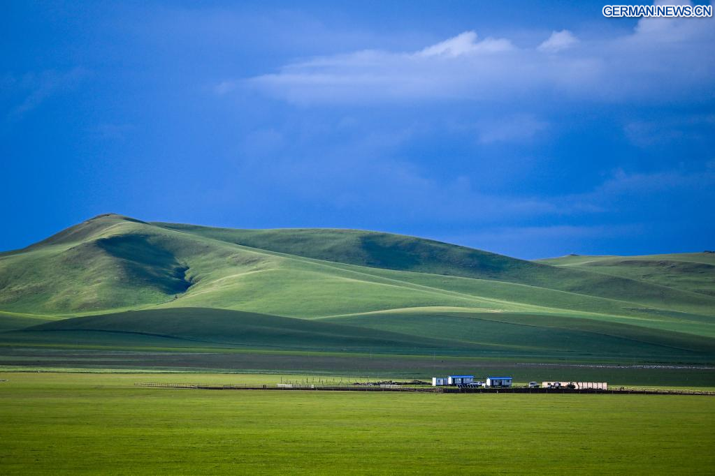 TONGLIAO, 6. Juli 2023 (Xinhuanet) -- Dieses am 5. Juli 2023 aufgenommene Foto zeigt die Landschaft des Graslands in Holin Gol des nordchinesischen Autonomen Gebiets Innere Mongolei. Das malerische Grasland in Holin Gol, das an der Kreuzung von Horqin Grassland, Xilin Gol Grassland und Hulunbuir Grassland liegt, ist eines der ursprünglichsten Grasländer des Autonomen Gebiets Innere Mongolei. (Quelle: Xinhua/Lian Zhen)