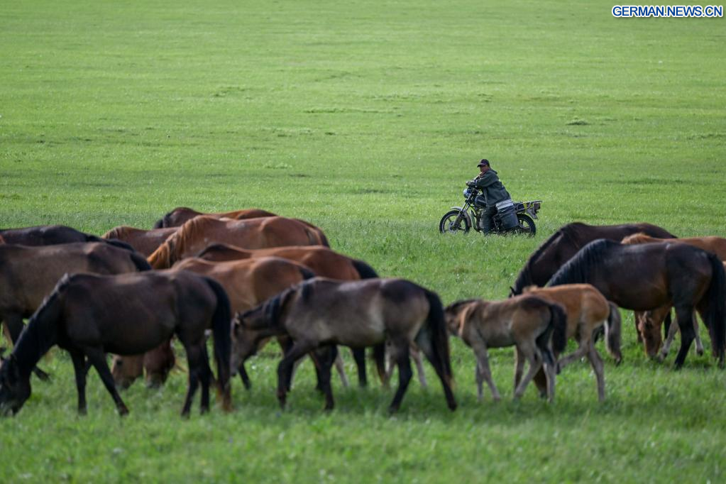 TONGLIAO, 6. Juli 2023 (Xinhuanet) -- Dieses am 5. Juli 2023 aufgenommene Foto zeigt einen Hirten, der Pferde auf einem Grasland in Holin Gol des nordchinesischen Autonomen Gebiets Innere Mongolei hütet. Das malerische Grasland in Holin Gol, das an der Kreuzung von Horqin Grassland, Xilin Gol Grassland und Hulunbuir Grassland liegt, ist eines der ursprünglichsten Grasländer des Autonomen Gebiets Innere Mongolei. (Quelle: Xinhua/Lian Zhen)