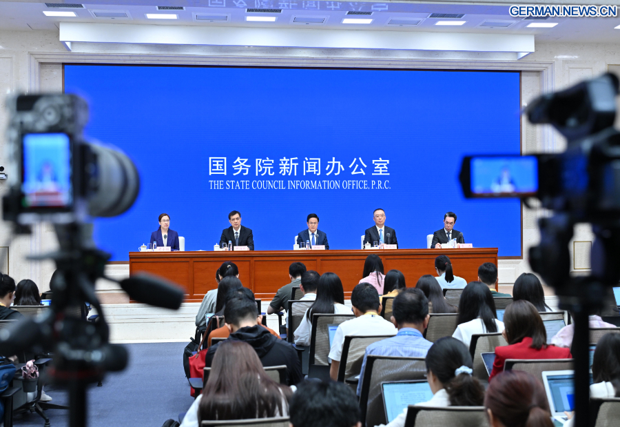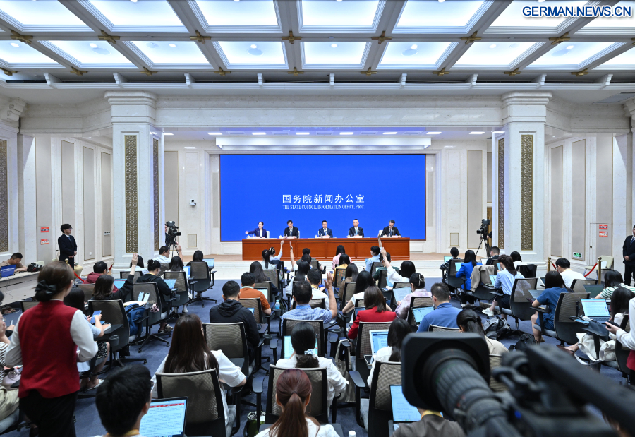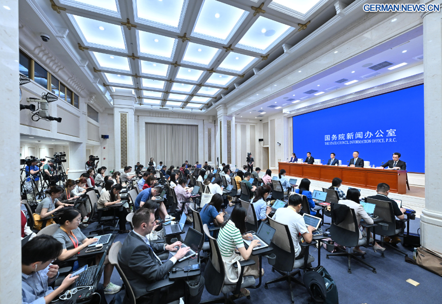 BEIJING, 9. Juli 2025 (Xinhua) -- Das Informationsbüro des chinesischen Staatsrats (SCIO) veranstaltet eine Pressekonferenz über die qualitativ hochwertige Erfüllung der für die Zeit des 14. Fünfjahresplans (2021-2025) gesetzten Ziele des Landes in Chinas Hauptstadt Beijing, 9. Juli 2025. Zheng Shanjie, Leiter der Staatlichen Kommission für Entwicklung und Reform (NDRC), Li Chunlin, stellvertretender Direktor der NDRC, Zhou Haibing, stellvertretender Direktor der NDRC, und Yuan Da, Generalsekretär der NDRC, präsentierten die Errungenschaften im Bereich der sozialen und wirtschaftlichen Entwicklung in diesem Zeitraum und beantworteten Fragen der Medien. (Xinhua/Li Xin)