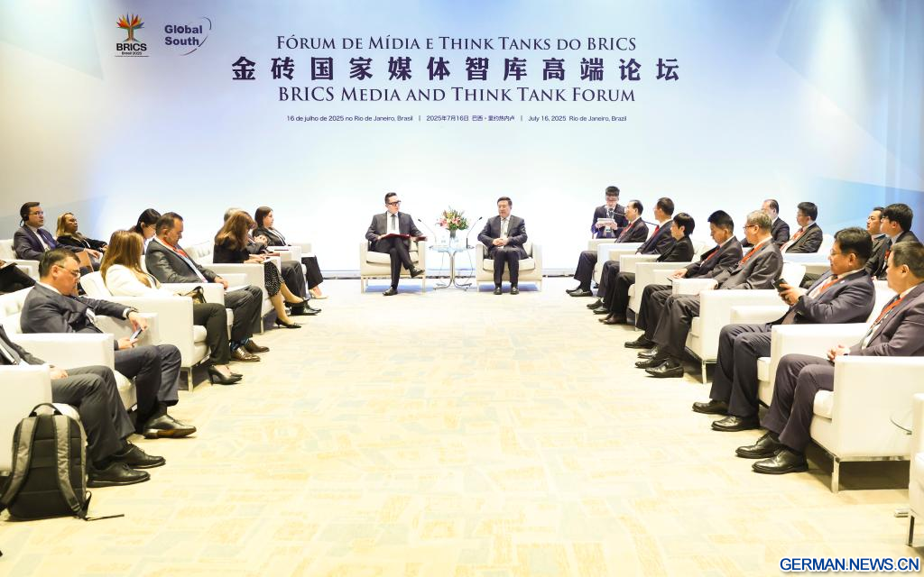 RIO DE JANEIRO, 17. Juli 2025 (Xinhuanet) -- Der Präsident der Nachrichtenagentur Xinhua, Fu Hua, trifft sich mit wichtigen Gästen, die am BRICS Media and Think Tank Forum teilnehmen, in Rio de Janeiro, Brasilien, 16. Juli 2025. (Quelle: Xinhua/Yao Dawei)