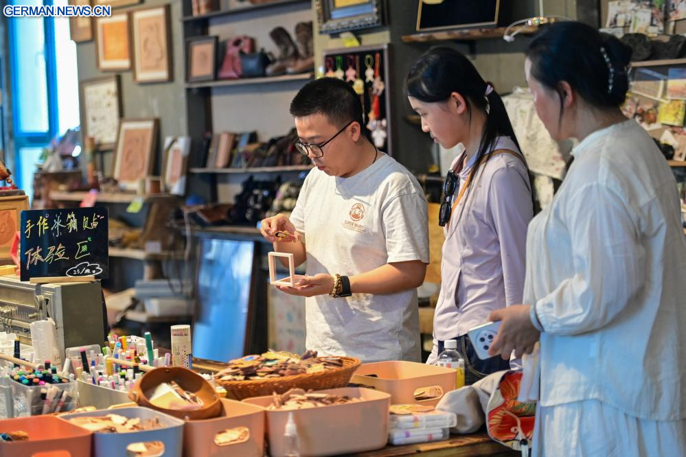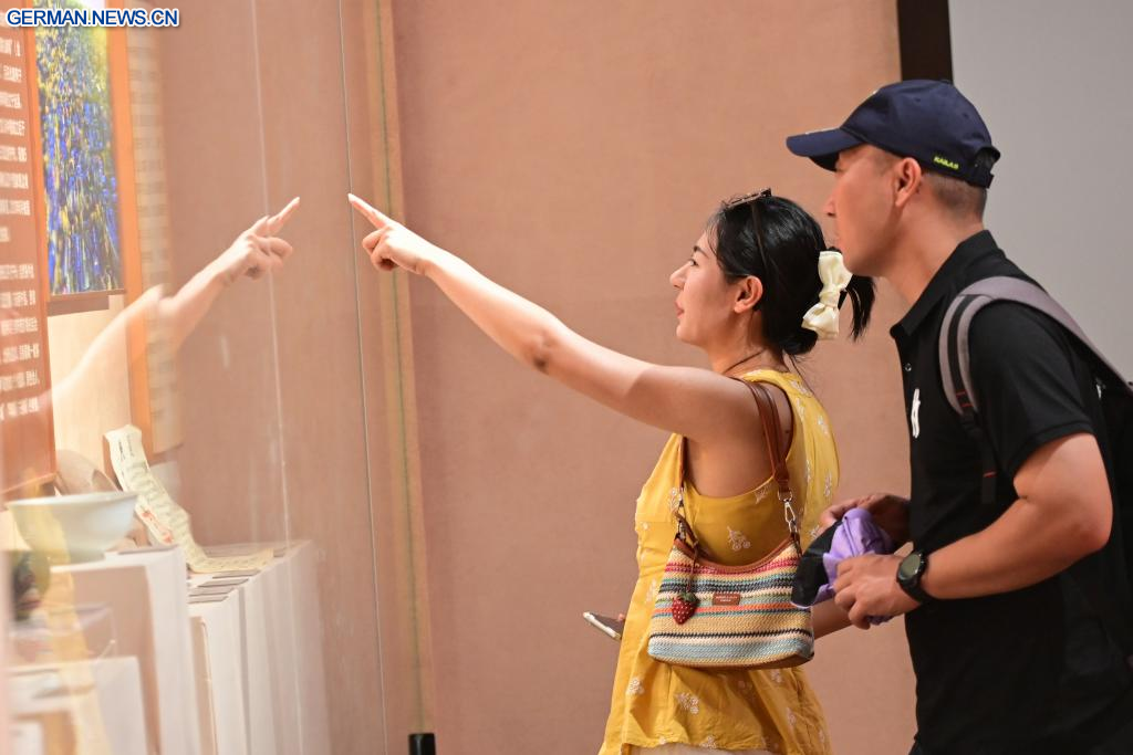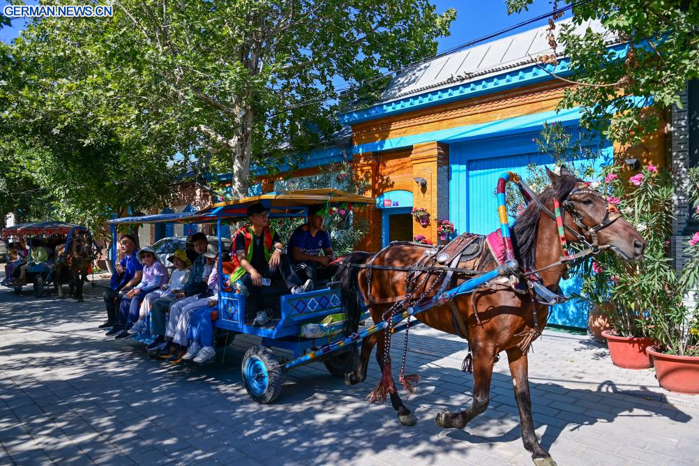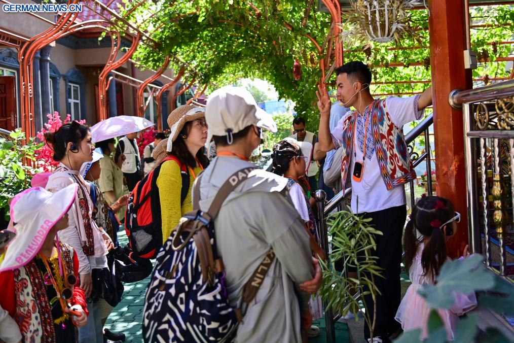 YINING, 24. Juli 2025 (Xinhuanet) -- Eine Touristin besucht die Granatapfelblüten-Ausstellungshalle im Kultur- und Tourismusgebiet Kazanqi in der Stadt Yining in der Kasachischen Autonomen Präfektur Ili im nordwestchinesischen Uigurischen Autonomen Gebiet Xinjiang, 23. Juli 2025. In den letzten Jahren hat die Stadt Yining ihre Altstadt durch die Integration von Kultur und Tourismus wiederbelebt. Die Stadt hat neun Kulturerbestätten und über 160 immaterielle Kulturgüter erhalten und gleichzeitig traditionelles Handwerk zu kreativen Industrien aktualisiert. Antike Architektur und Wohngebäude wurden in Touristenattraktionen umgewandelt, wobei Arbeitsplätze geschaffen wurden und der Altstadt die Vitalität gebracht wurde. (Quelle: Xinhua/Ding Lei)