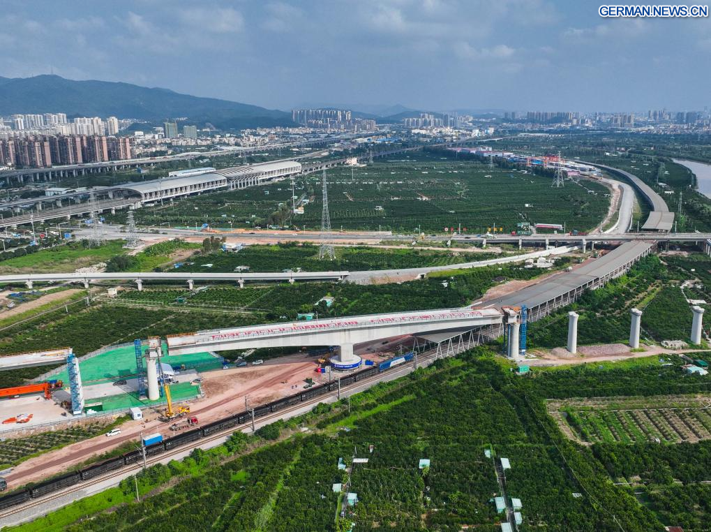 JIANGMEN, 10. Oktober 2025 (Xinhuanet) -- Die Luftaufnahme einer Drohne zeigt eine Drehbrücke, die in die vorgesehene Position entlang der Hochgeschwindigkeitsbahnstrecke Shenzhen-Jiangmen in der südchinesischen Provinz Guangdong gedreht wird, 10. Oktober 2025.