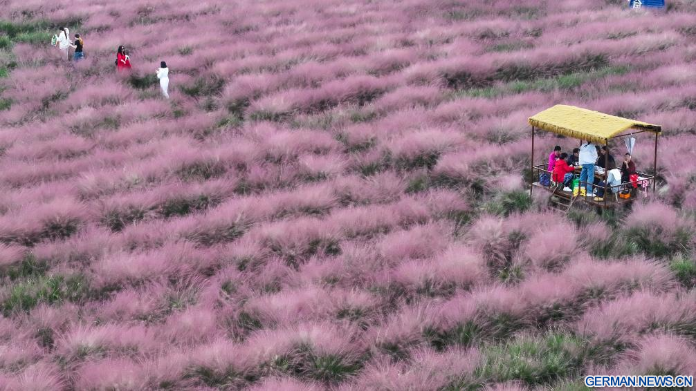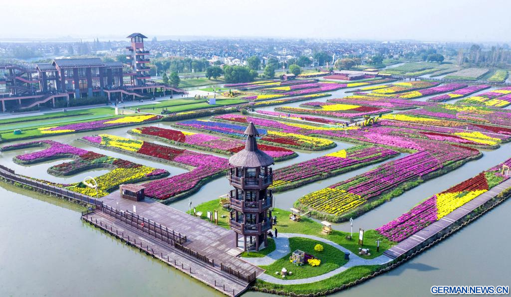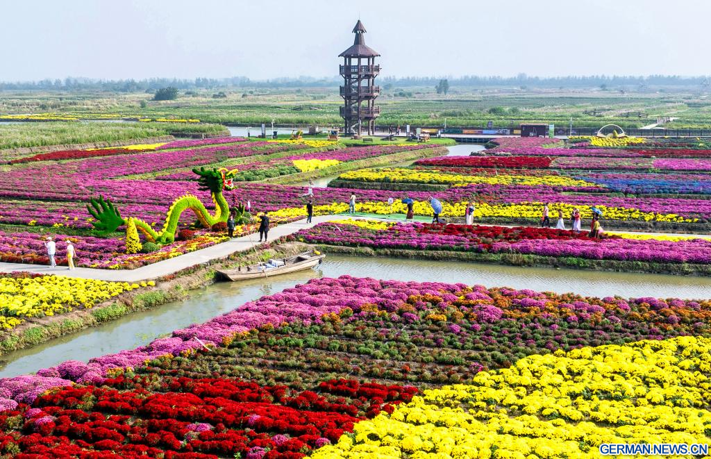 BEIJING, 13. Oktober 2025 (Xinhuanet) -- Die Luftaufnahme einer Drohne vom 13. Oktober 2025 zeigt Touristen, die sich inmitten von Blumen auf einer Farm in der Stadt Yizheng in der ostchinesischen Provinz Jiangsu vergnügen. (Foto von Qi Liguang/Xinhua)