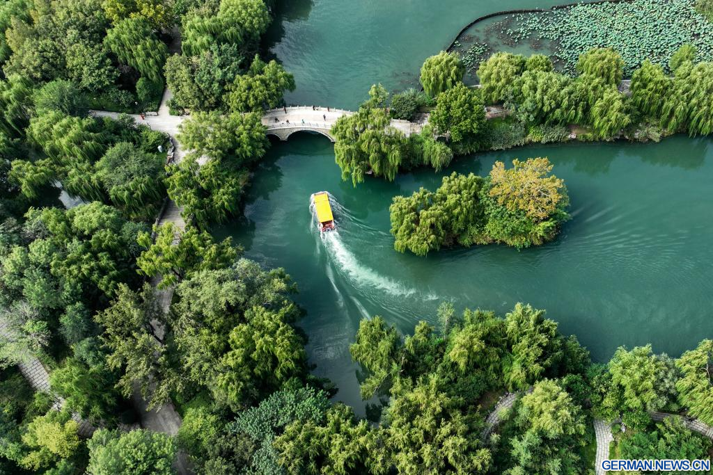 BEIJING, 13. Oktober 2025 (Xinhuanet) -- Die Luftaufnahme einer Drohne vom 13. Oktober 2025 zeigt Touristen bei einer Bootstour an einem Landschaftsort in der Stadt Jinan in der ostchinesischen Provinz Shandong. (Foto von Hao Xincheng/Xinhua)