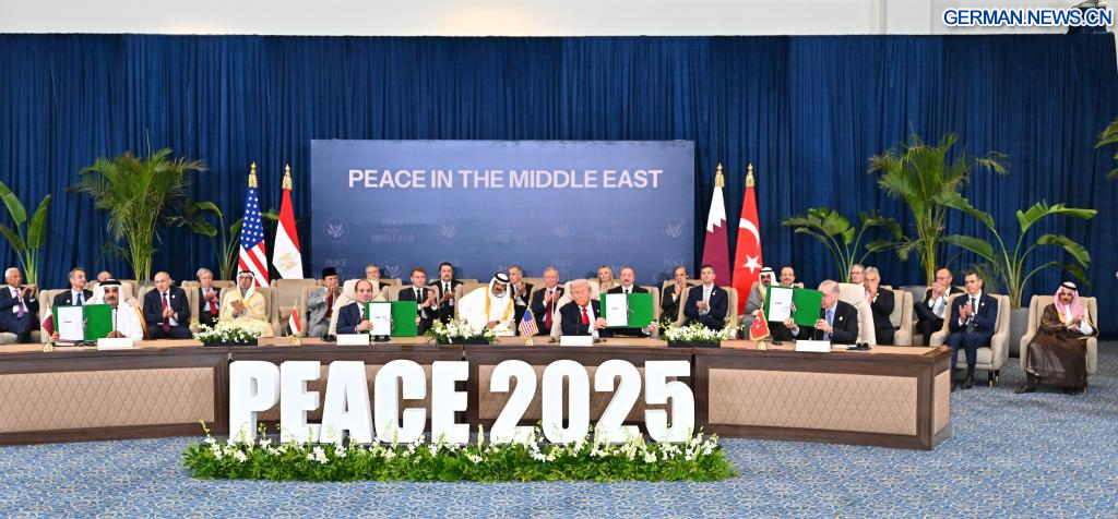 SCHARM EL-SCHEICH (ÄGYPTEN), 13. Oktober 2025 (Xinhuanet) -- Der ägyptische Präsident Abdel Fattah al-Sisi (2. v. l., vorne), US-Präsident Donald Trump (2. v. r., vorne), der türkische Präsident Recep Tayyip Erdogan (1. v. r., vorne) und der Emir von Katar, Sheikh Tamim bin Hamad Al Thani (1. v. l., vorne) nehmen an der Unterzeichnung eines Dokuments zur Unterstützung des Gaza-Waffenstillstandsabkommens während eines Gipfels über den Gaza-Waffenstillstand in Scharm el-Scheich, Ägypten, teil, 13. Oktober 2025. Ein Dokument zur Unterstützung des kürzlich erzielten Gaza-Waffenstillstandsabkommens wurde hier am Montag von den vier Vermittlern des Abkommens unterzeichnet, allerdings ohne die Anwesenheit von Israel oder der Hamas. (Quelle: Ägyptische Präsidentschaft/Handout via Xinhua)