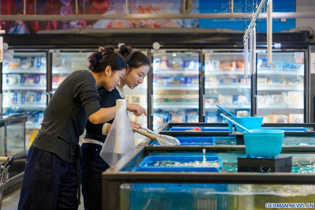 BEIJING, 15. Oktober 2025 (Xinhuanet) -- Kunden wählen Gemüse in einem Supermarkt in der Stadt Tangshan in der nordchinesischen Provinz Hebei aus, 15. Oktober 2025.