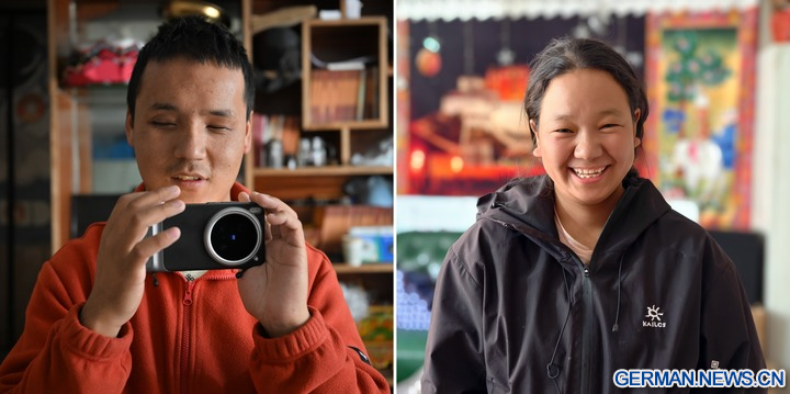 LHASA, 16. Oktober 2025 (Xinhua) -- Die Fotocollage zeigt Tawa Tsering, wie er in Lhasa im Autonomen Gebiet Xizang im Südwesten Chinas, Fotos von seiner Frau Bumchok macht (links, Foto von Xinhua-Fotograf Zhang Cheng), und ein Foto von Bumchok, aufgenommen von Tawa Tsering (rechts), 10. Oktober 2025. Der 26-jährige Tawa Tsering ist Musiker der Band „Kardag Garbo“, der ersten Band in Xizang, die aus sehbehinderten Mitgliedern besteht. Die Band wurde 2014 gegründet und ihr Name bedeutet „reinweißer Khata“, ein zeremonieller weißer Schal, der guten Willen und Segen symbolisiert.