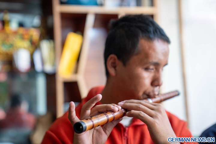LHASA, 16. Oktober 2025 (Xinhua) -- Tawa Tsering spielt Flöte in Lhasa im Autonomen Gebiet Xizang im Südwesten Chinas, 10. Oktober 2025. Der 26-jährige Tawa Tsering ist Musiker der Band „Kardag Garbo“, der ersten Band in Xizang, die aus sehbehinderten Mitgliedern besteht. Die Band wurde 2014 gegründet und ihr Name bedeutet „reinweißer Khata“, ein zeremonieller weißer Schal, der guten Willen und Segen symbolisiert.