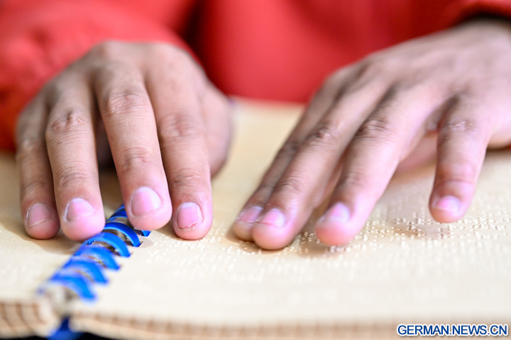 LHASA, 16. Oktober 2025 (Xinhua) -- Tawa Tsering liest ein Buch in Braille-Schrift in Lhasa im Autonomen Gebiet Xizang im Südwesten Chinas, 10. Oktober 2025. Der 26-jährige Tawa Tsering ist Musiker der Band „Kardag Garbo“, der ersten Band in Xizang, die aus sehbehinderten Mitgliedern besteht. Die Band wurde 2014 gegründet und ihr Name bedeutet „reinweißer Khata“, ein zeremonieller weißer Schal, der guten Willen und Segen symbolisiert.