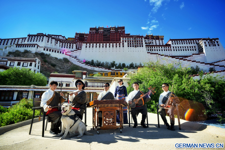 LHASA, 16. Oktober 2025 (Xinhua) -- Mitglieder der Band „Kardag Garbo“ posieren für ein Gruppenfoto vor dem Potala-Palast in Lhasa im Autonomen Gebiet Xizang im Südwesten Chinas, 17. Juni 2025. Der 26-jährige Tawa Tsering ist Musiker der Band „Kardag Garbo“, der ersten Band in Xizang, die aus sehbehinderten Mitgliedern besteht. Die Band wurde 2014 gegründet und ihr Name bedeutet „reinweißer Khata“, ein zeremonieller weißer Schal, der guten Willen und Segen symbolisiert.