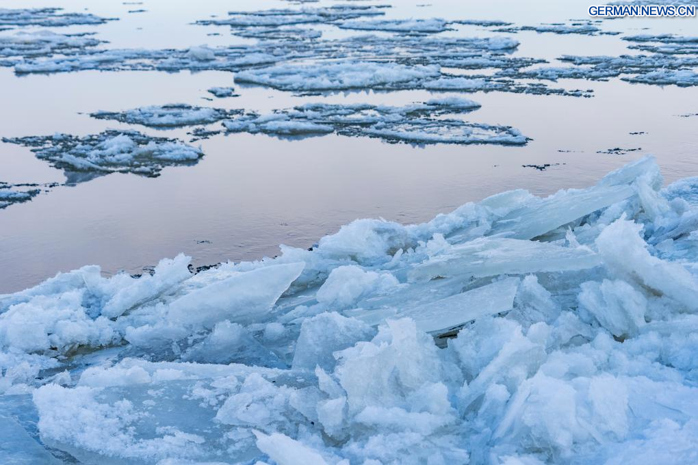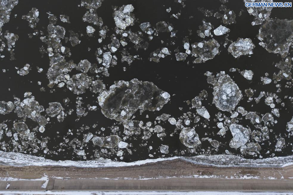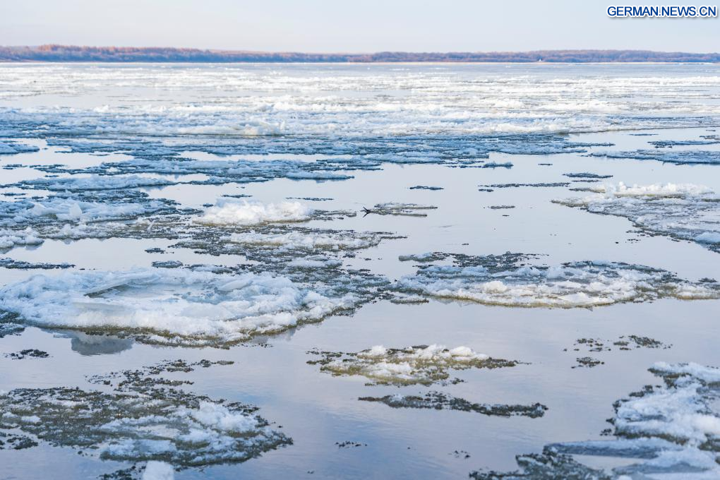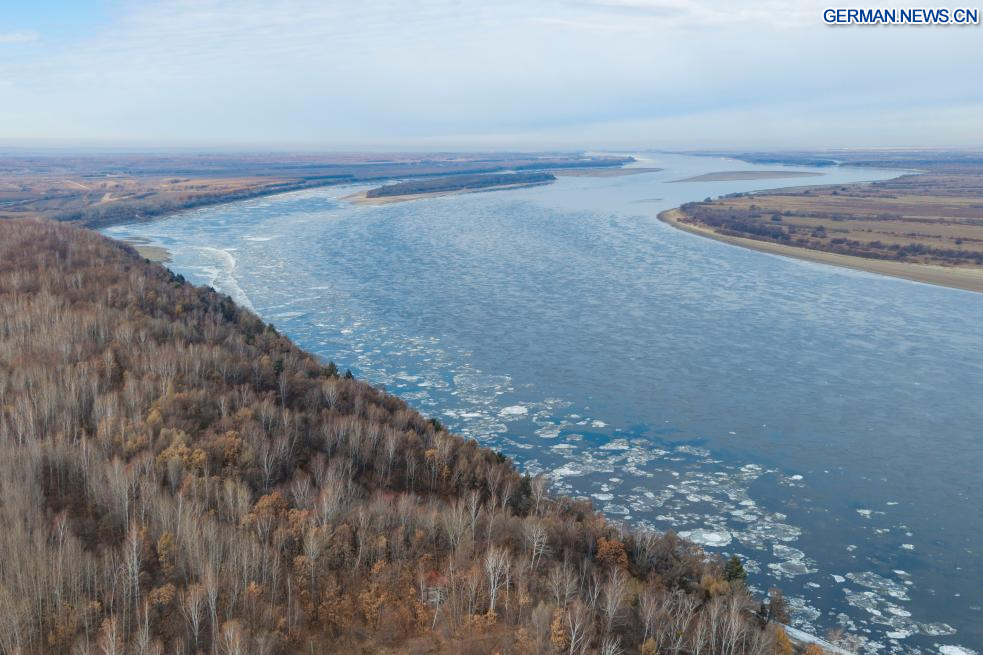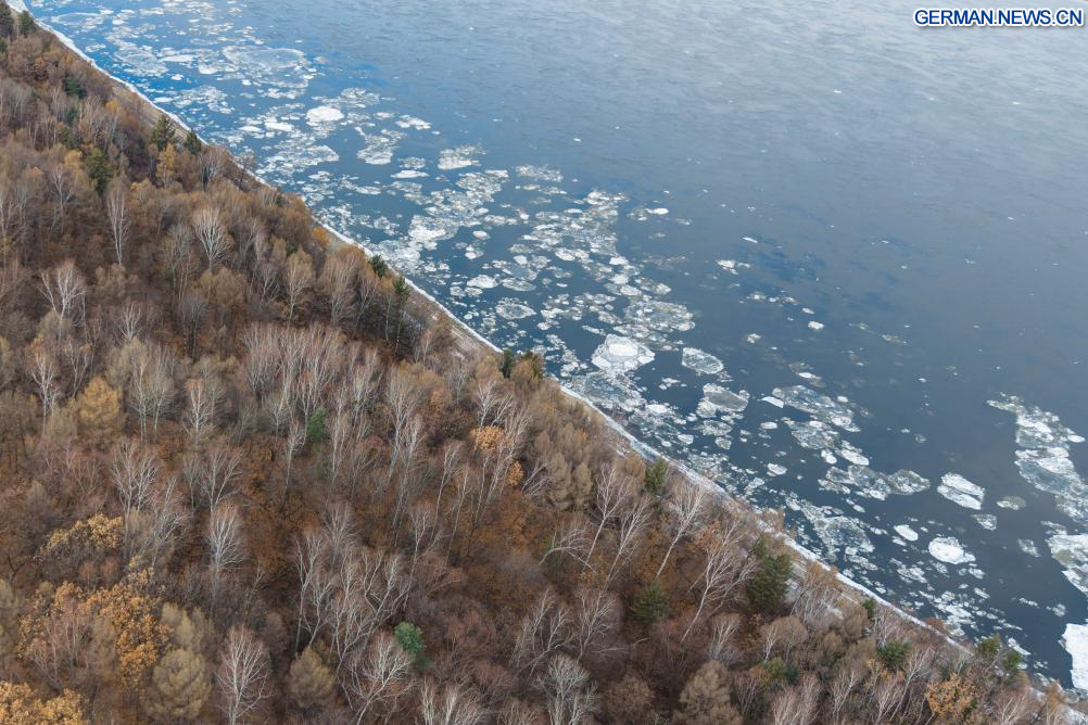 YICHUN, 5. November 2025 (Xinhuanet) -- Das Foto vom 5. November 2025 zeigt den Abschnitt Jiayin des Heilongjiang-Flusses, der mit Treibeis bedeckt ist, in der Stadt Yichun in der nordostchinesischen Provinz Heilongjiang. Mit sinkenden Temperaturen kam es im Abschnitt Jiayin des Heilongjiang-Flusses zu Treibeis. (Quelle: Xinhua/Xie Jianfei)