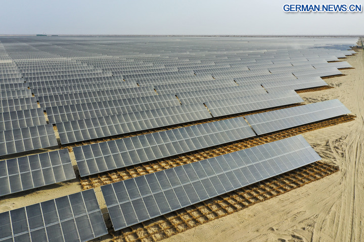 URUMQI, 30. November 2025 (Xinhua) -- Die Drohnenaufnahme zeigt ein Photovoltaik-Kraftwerksprojekt im Kreis Shaya der Präfektur Aksu im Uigurischen Autonomen Gebiet Xinjiang im Nordwesten Chinas, 13. April 2025. (Xinhua/Ding Lei)