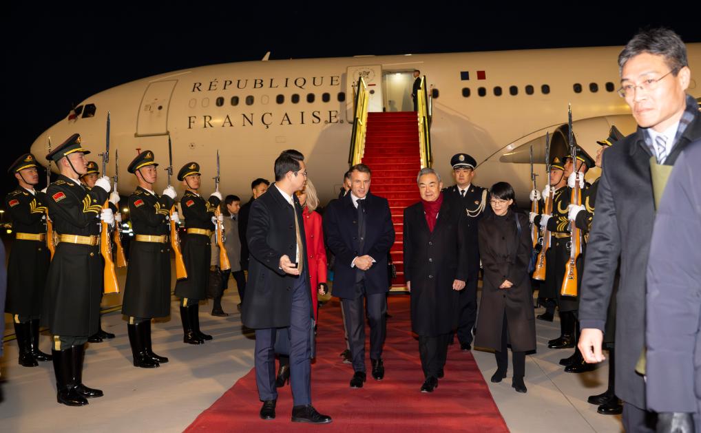 BEIJING, 3. Dezember 2025 (Xinhuanet) -- Der französische Präsident Emmanuel Macron trifft in Chinas Hauptstadt Beijing ein, 3. Dezember 2025. Auf Einladung des chinesischen Staatspräsidenten Xi Jinping traf Macron am Mittwoch zu einem Staatsbesuch in China ein, der bis Freitag dauert. (Quelle: Xinhua/Cai Yang)