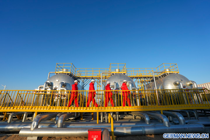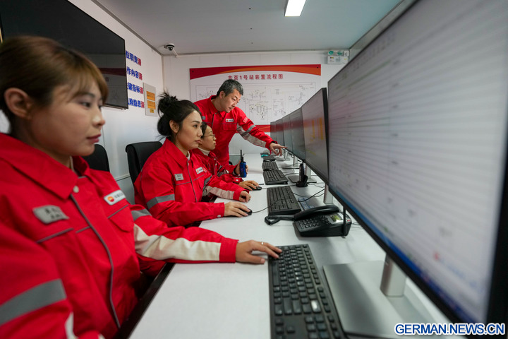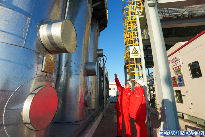 DAQING, 5. Dezember 2025 (Xinhua) -- Das Foto zeigt Techniker bei der Überprüfung von Betriebsparametern an Öl- und Gasverarbeitungsanlagen in einer nationalen Demonstrationszone für kontinentales Schieferöl des Daqing-Ölfelds in Daqing in der Provinz Heilongjiang im Nordosten Chinas, 4. Dezember 2025. Das Daqing-Ölfeld, eine der größten Energieproduktionsstätten Chinas, gab am Freitag bekannt, dass die jährliche Schieferölproduktion in der Demonstrationszone eine Million Tonnen überschritten hat. (Xinhua/Wang Song)