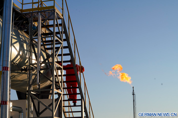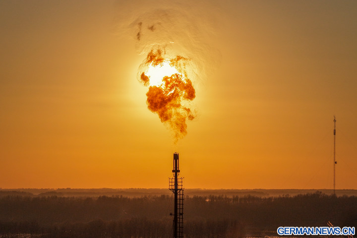 DAQING, 5. Dezember 2025 (Xinhua) -- Die Luftaufnahme einer Drohne zeigt das Abfackeln von Gas in einer nationalen Demonstrationszone für kontinentales Schieferöl des Daqing-Ölfelds in Daqing in der Provinz Heilongjiang im Nordosten Chinas, 4. Dezember 2025. Das Daqing-Ölfeld, eine der größten Energieproduktionsstätten Chinas, gab am Freitag bekannt, dass die jährliche Schieferölproduktion in der Demonstrationszone eine Million Tonnen überschritten hat. (Xinhua/Wang Song)