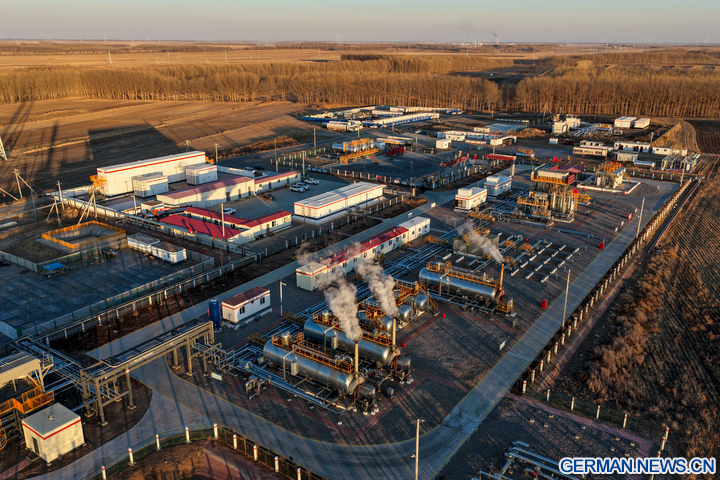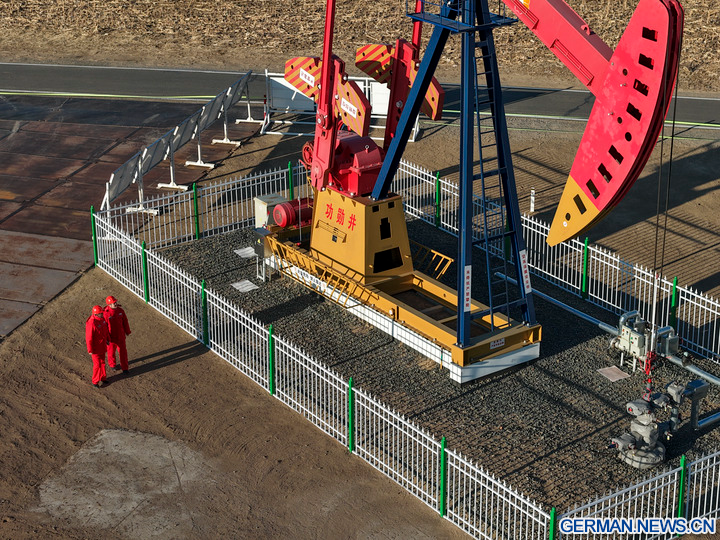 DAQING, 5. Dezember 2025 (Xinhua) -- Die Luftaufnahme einer Drohne zeigt einen Blick auf eine nationale Demonstrationszone für kontinentales Schieferöl des Daqing-Ölfelds in Daqing in der Provinz Heilongjiang im Nordosten Chinas, 4. Dezember 2025. Das Daqing-Ölfeld, eine der größten Energieproduktionsstätten Chinas, gab am Freitag bekannt, dass die jährliche Schieferölproduktion in der Demonstrationszone eine Million Tonnen überschritten hat. (Xinhua/Wang Song)