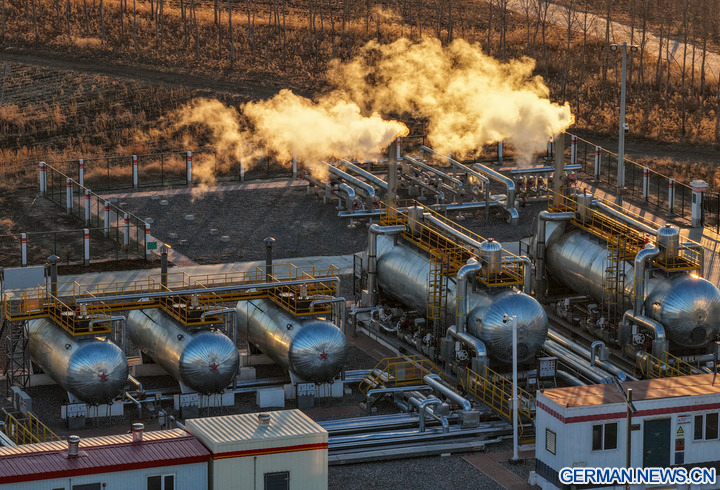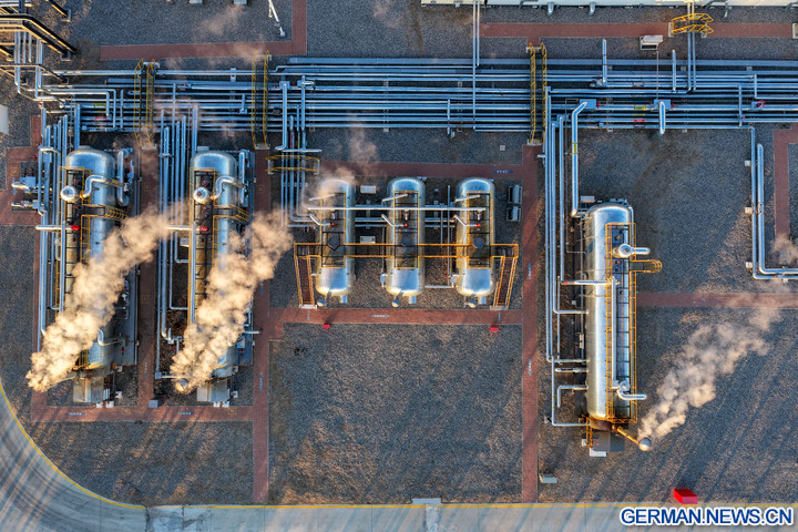 DAQING, 5. Dezember 2025 (Xinhua) -- Das Foto zeigt einen Arbeiter bei Inspektionsarbeiten an Öl- und Gasverarbeitungsanlagen in einer nationalen Demonstrationszone für kontinentales Schieferöl des Daqing-Ölfelds in Daqing in der Provinz Heilongjiang im Nordosten Chinas, 4. Dezember 2025. Das Daqing-Ölfeld, eine der größten Energieproduktionsstätten Chinas, gab am Freitag bekannt, dass die jährliche Schieferölproduktion in der Demonstrationszone eine Million Tonnen überschritten hat. (Xinhua/Wang Song)