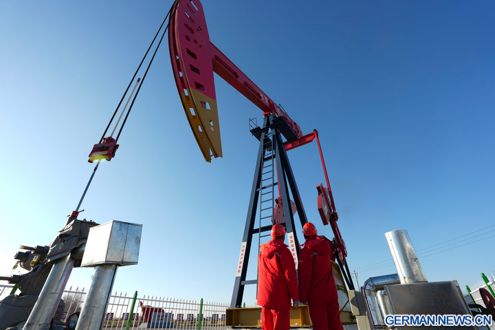 DAQING, 5. Dezember 2025 (Xinhua) -- Das Foto zeigt Arbeiter bei Inspektionsarbeiten an Ölförderanlagen in einer nationalen Demonstrationszone für kontinentales Schieferöl des Daqing-Ölfelds in Daqing in der Provinz Heilongjiang im Nordosten Chinas, 4. Dezember 2025. Das Daqing-Ölfeld, eine der größten Energieproduktionsstätten Chinas, gab am Freitag bekannt, dass die jährliche Schieferölproduktion in der Demonstrationszone eine Million Tonnen überschritten hat. (Xinhua/Wang Song)