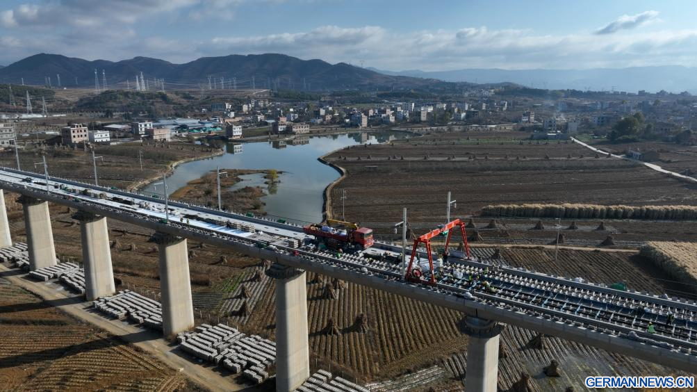 ZHAOTONG, 7. Dezember 2025 (Xinhuanet) -- Die Luftaufnahme einer Drohne vom 7. Dezember 2025 zeigt eine Baustelle der Hochgeschwindigkeitsstrecke Chongqing-Kunming in Zhaotong in der südwestchinesischen Provinz Yunnan. (Foto von Zhang Guangyu/Xinhua)