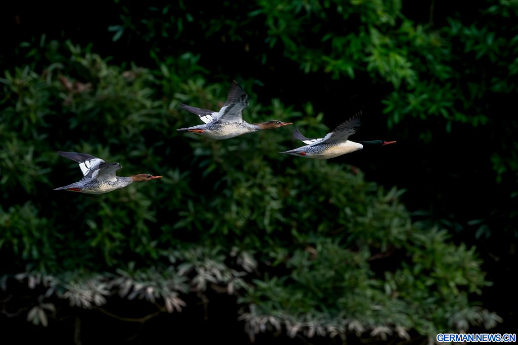 FUZHOU, 21. Dezember 2025 (Xinhuanet) -- Chinesische Gänsesäger fliegen über dem Dazhang-Fluss im Kreis Yongtai in der südostchinesischen Provinz Fujian, 20. Dezember 2025. Sechzehn chinesische Gänsesäger, eine Tierart, die unter nationalem Schutz der ersten Kategorie steht, wurden hier beim Überwintern gesichtet. (Quelle: Xinhua/Wei Peiquan)
