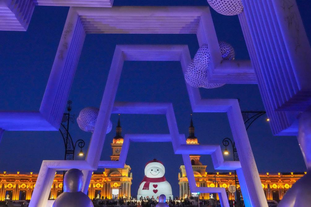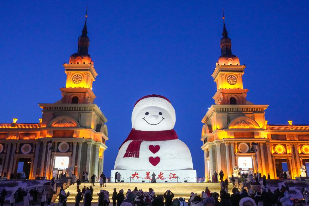 HARBIN, 11. Januar 2026 (Xinhuanet) -- Touristen fotografieren den berühmten riesigen Schneemann im Qunli-Musikpark in Harbin in der nordostchinesischen Provinz Heilongjiang, 10. Januar 2026.