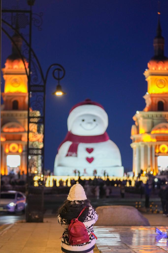 Der 19 Meter hohe, 14 Meter lange und 11 Meter breite Schneemann entstand aus über 3.500 Kubikmetern Schnee. Touristen strömten herbei, um Fotos von seinem klassischen roten Schal und seinem runden Gesicht zu machen. (Quelle: Xinhua/Wang Jianwei)