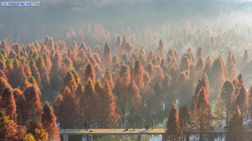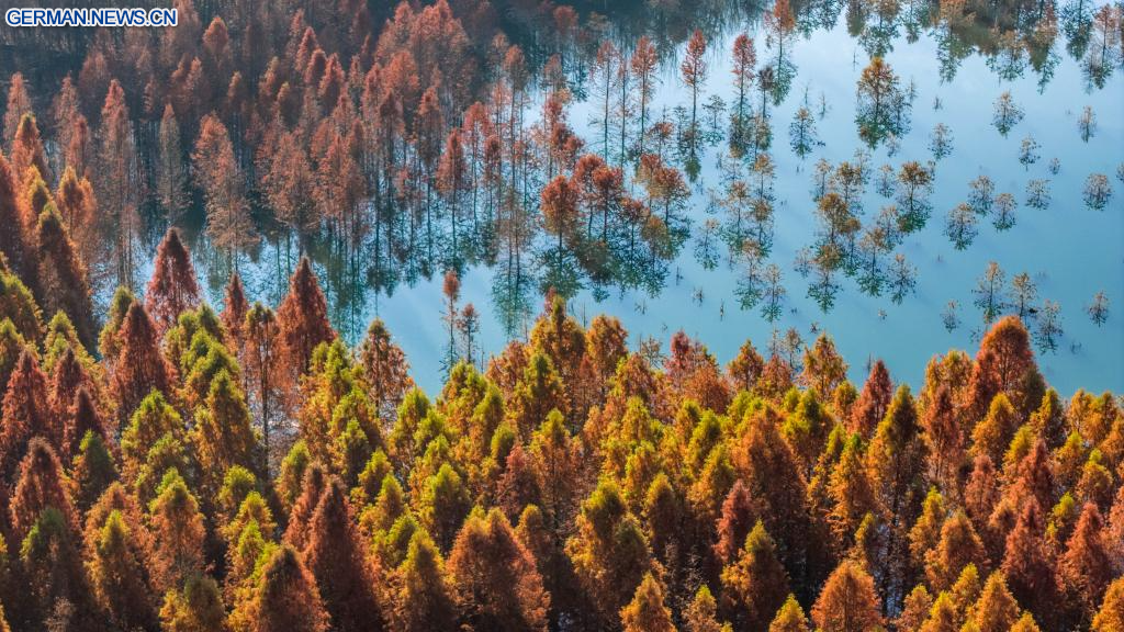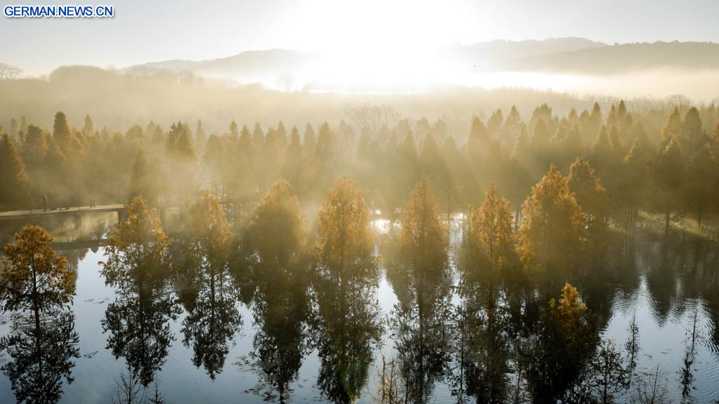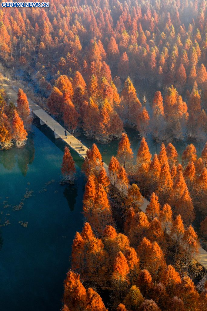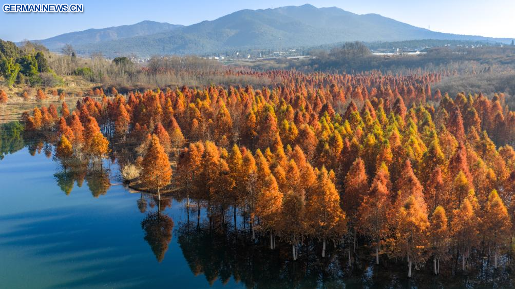 KUNMING, 14. Januar 2026 (Xinhuanet) -- Die Luftaufnahme einer Drohne vom 14. Januar 2026 zeigt ein Metasequoia-Feuchtgebiet im Bezirk Panlong in Kunming in der südwestchinesischen Provinz Yunnan. (Quelle: Xinhua/Hu Chao)