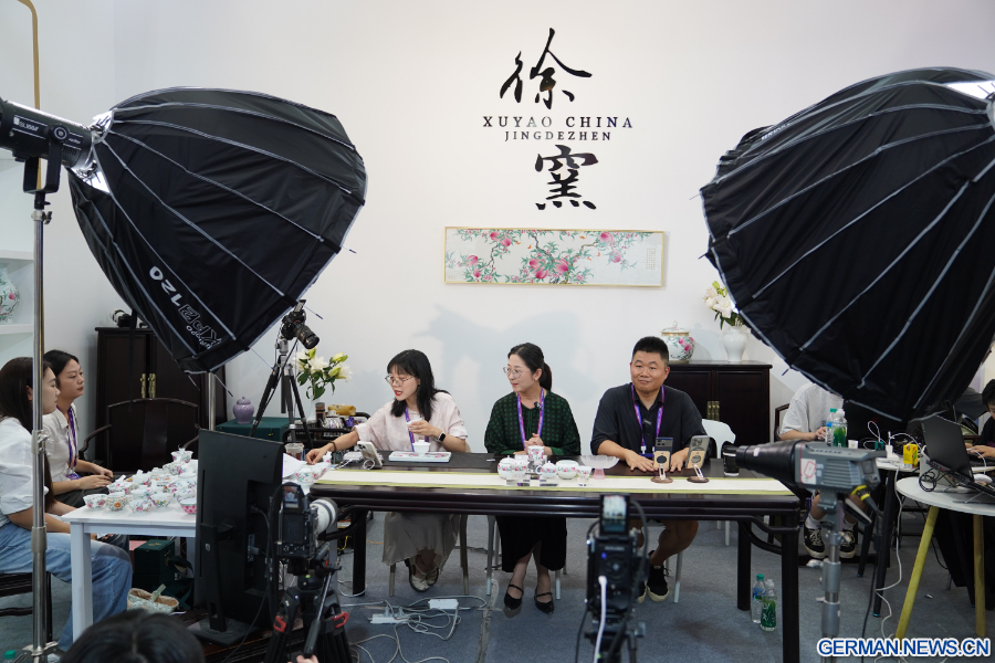 Aussteller bewerben Keramikprodukte per Livestream während der China Jingdezhen International Ceramic Expo 2025 in Jingdezhen in der Provinz Jiangxi in Ostchina, 18. Oktober 2025. (Xinhua/Zhou Mi)