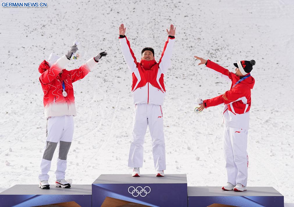 LIVIGNO, 20. Februar 2026 (Xinhuanet) -- Der Goldmedaillengewinner Wang Xindi (M.) aus China reagiert während der Siegerehrung für Aerials-Wettbewerb im Freestyle-Skiing der Männer bei den Olympischen Winterspielen 2026 in Mailand-Cortina in Livigno, Italien, 20. Februar 2026. (Quelle: Xinhua/Wu Huiwo)