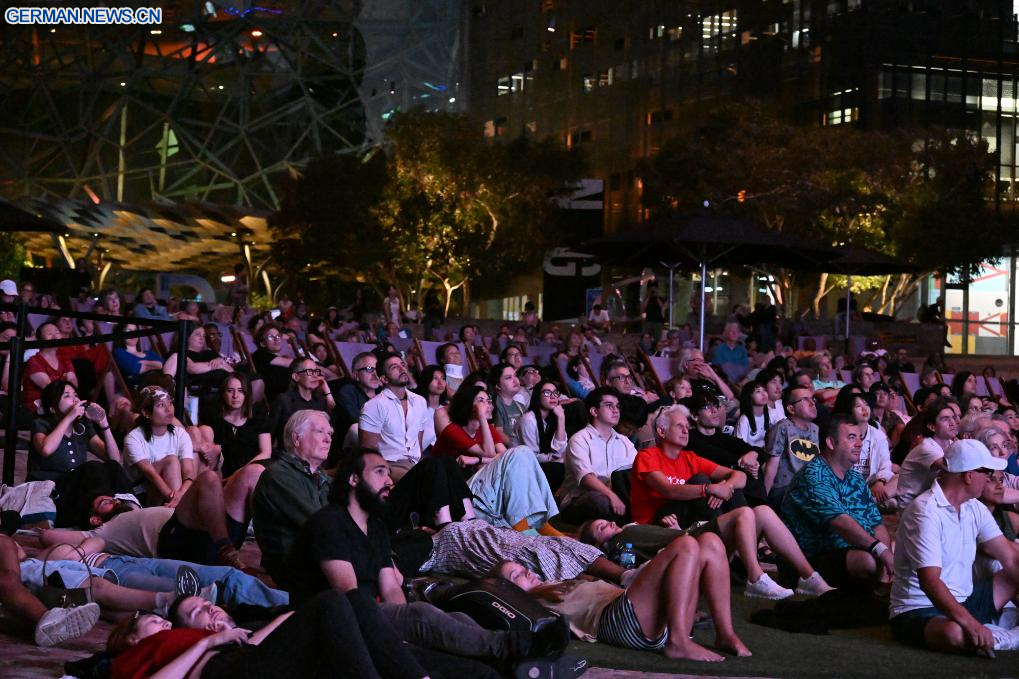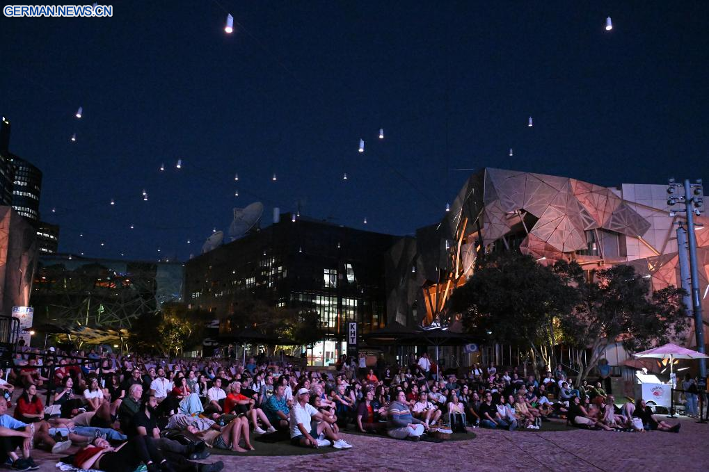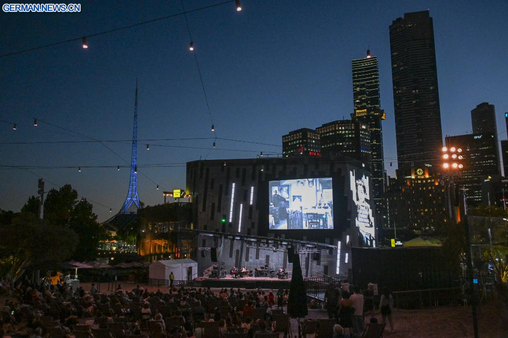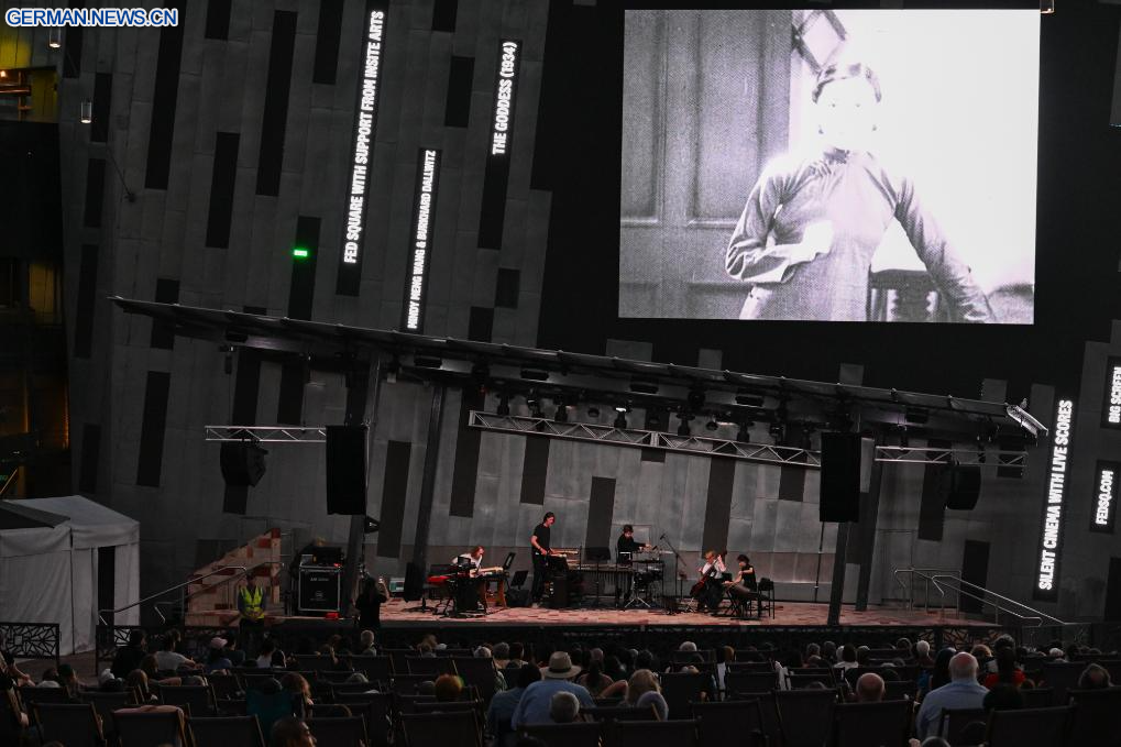 MELBOURNE, 20. Februar 2026 (Xinhuanet) -- Der chinesische Stummfilmklassiker „The Goddess“ aus dem Jahr 1934 wird auf dem Federation Square in Melbourne, Australien, gezeigt, 20. Februar 2026. Dies ist der letzte Stummfilm, der hier vom 16. bis 20. Februar gezeigt wird. (Quelle: Xinhua/Xu Haijing)