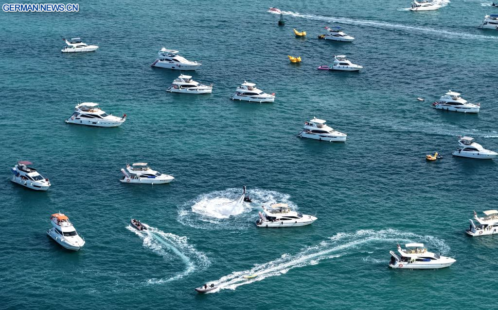 SANYA, 21. Februar 2026 (Xinhuanet) -- Das am 21. Februar 2026 aufgenommene Drohnenfoto zeigt Touristen, die mit Yachten fahren, in Sanya in der südchinesischen Provinz Hainan. Während der ersten Frühlingsfestferien seit der Einführung der speziellen Zollmaßnahmen auf der gesamten Insel im chinesischen Freihandelshafen Hainan hat sich die südliche Tropeninsel zu einem beliebten Ziel für Yachtausflüge entwickelt. Daten zufolge wurden in den ersten sechs Tagen der Frühlingsfestferien über 7.000 Yachtfahrten in Sanya unternommen. (Quelle: Xinhua/Zhao Yingquan)