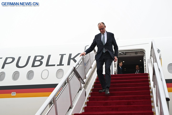 BEIJING, 25. Februar 2026 (Xinhua) -- Bundeskanzler Friedrich Merz trifft in der chinesischen Hauptstadt Beijing ein, 25. Februar 2026. Merz traf am Mittwoch zu einem bis Donnerstag dauernden offiziellen Besuch in China ein. (Xinhua/Dai Tianfang)