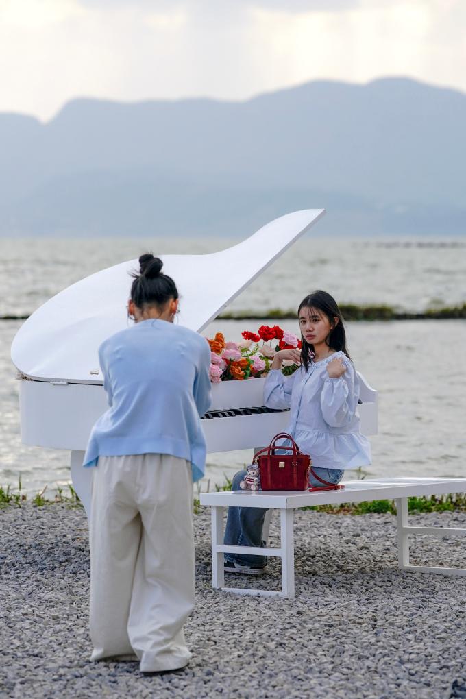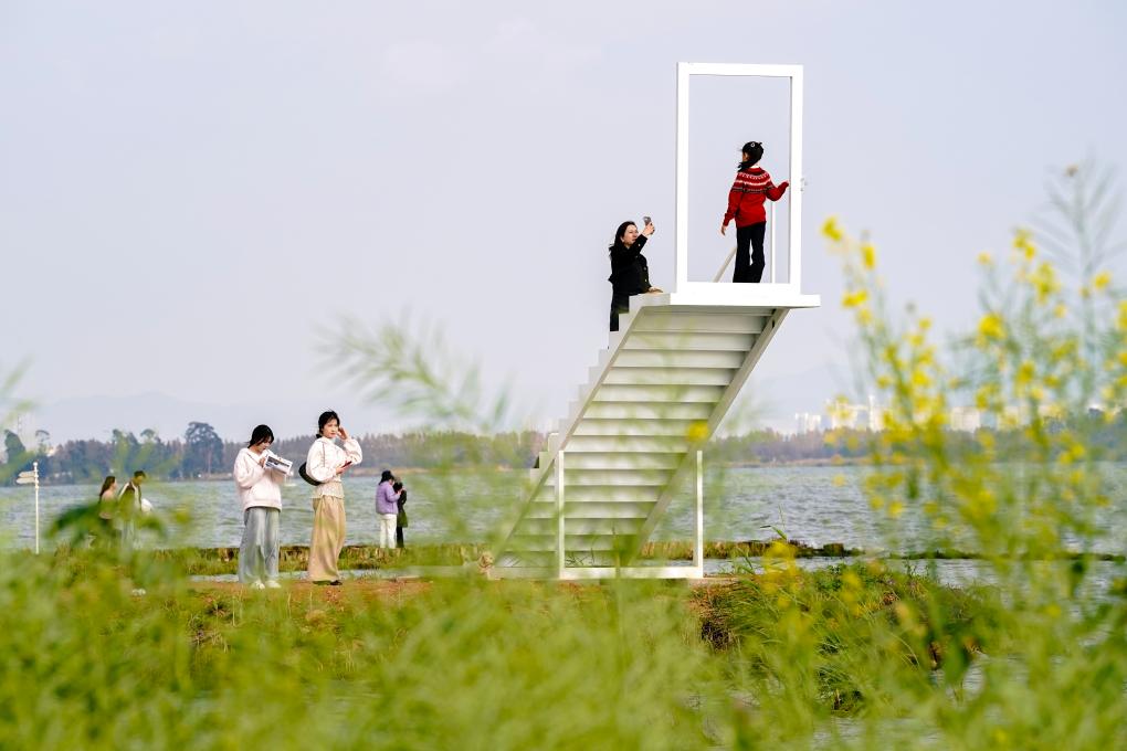 KUNMING, 26. Februar 2026 (Xinhuanet) -- Touristinnen machen Fotos auf einer Installation am Dianchi-See in der Stadt Kunming der südwestchinesischen Provinz Yunnan, 26. Februar 2026. (Quelle: Xinhua/Chen Xinbo)