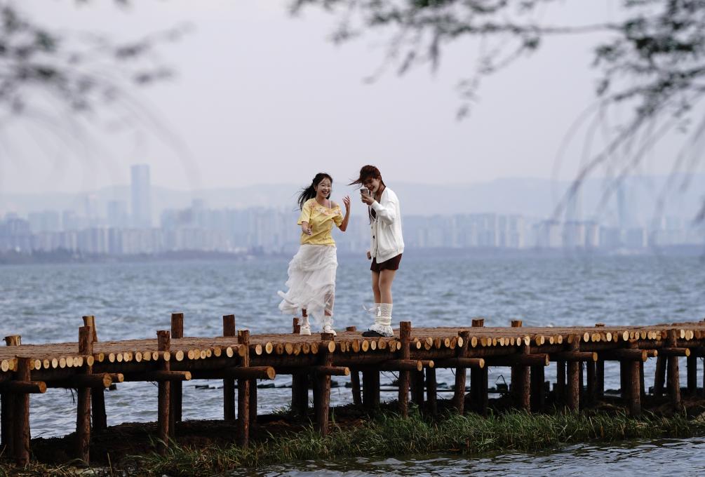 KUNMING, 26. Februar 2026 (Xinhuanet) -- Touristinnen machen Fotos am Dianchi-See in der Stadt Kunming der südwestchinesischen Provinz Yunnan, 26. Februar 2026. (Quelle: Xinhua/Chen Xinbo)
