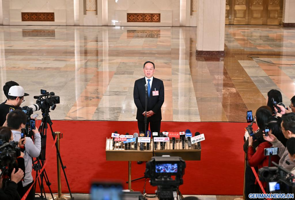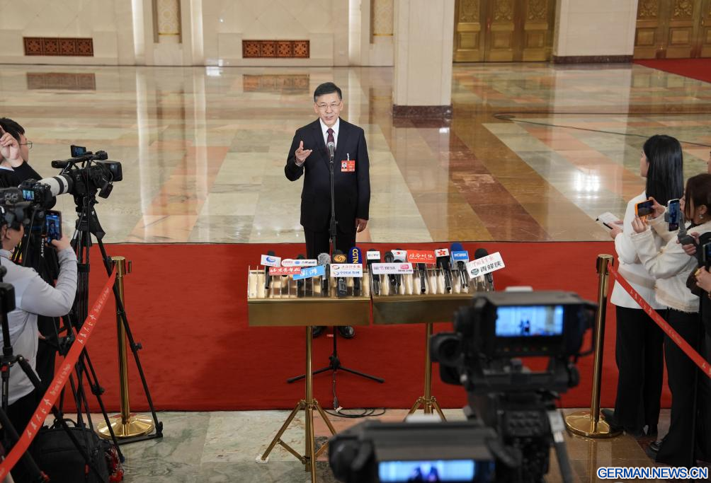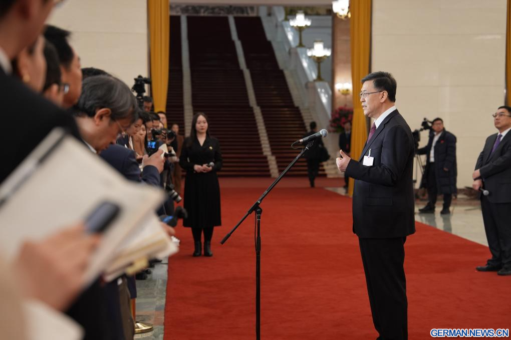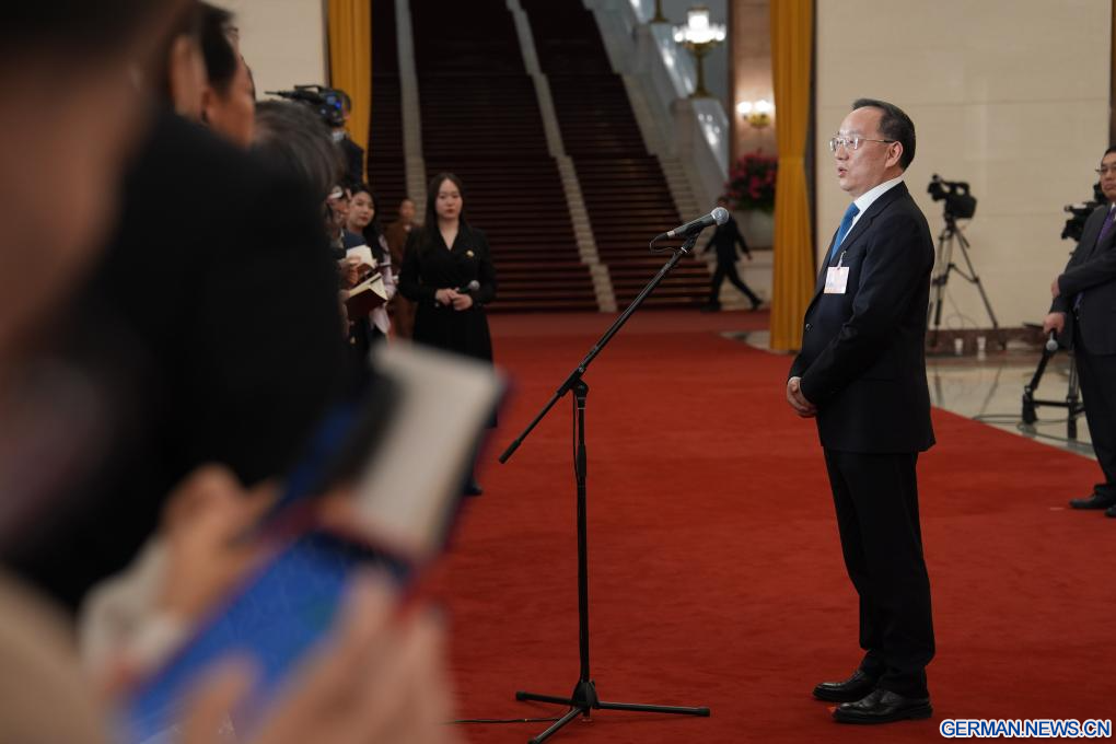BEIJING, 5. März 2026 (Xinhuanet) -- Der chinesische Minister für Wissenschaft und Technologie, Yin Hejun, gibt nach der Eröffnungssitzung der vierten Tagung des 14. Nationalen Volkskongresses (NVK) in der Großen Halle des Volkes in der chinesischen Hauptstadt Beijing ein Interview, 5. März 2026. (Quelle: Xinhua/Wang Xi)