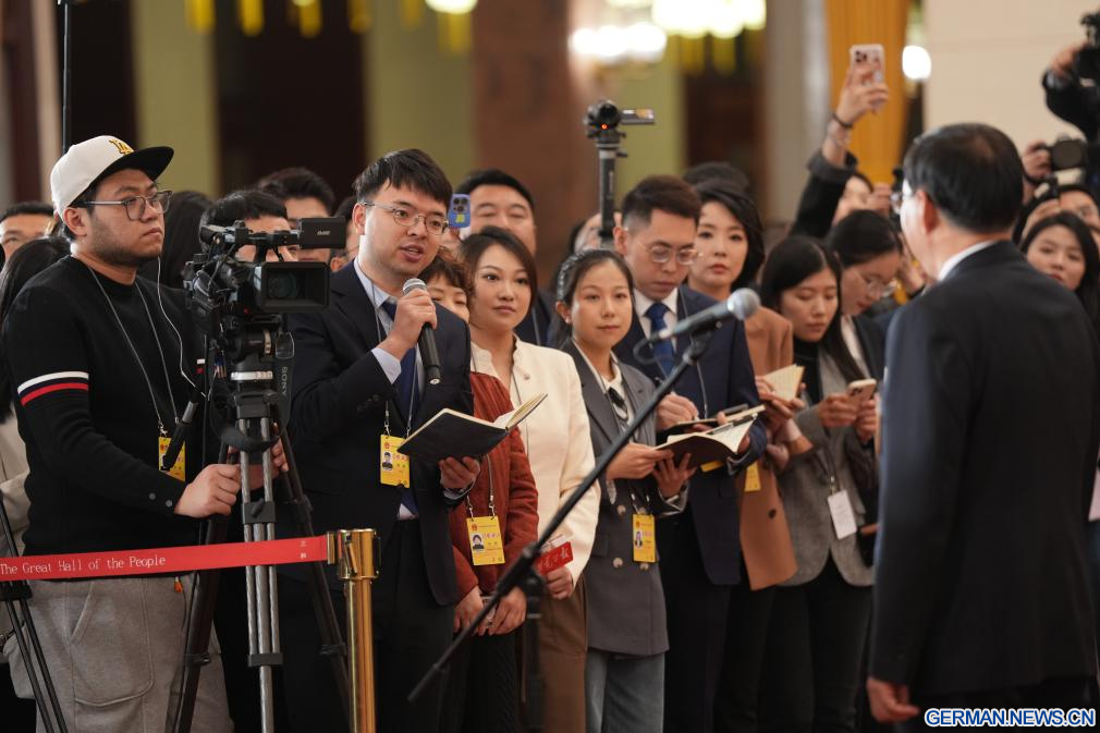 BEIJING, 5. März 2026 (Xinhuanet) -- Ein Journalist stellt während eines Interviews mit Ministern nach der Eröffnungssitzung der vierten Tagung des 14. Nationalen Volkskongresses (NVK) in der Großen Halle des Volkes in der chinesischen Hauptstadt Beijing eine Frage, 5. März 2026. (Quelle: Xinhua/Wang Xi)