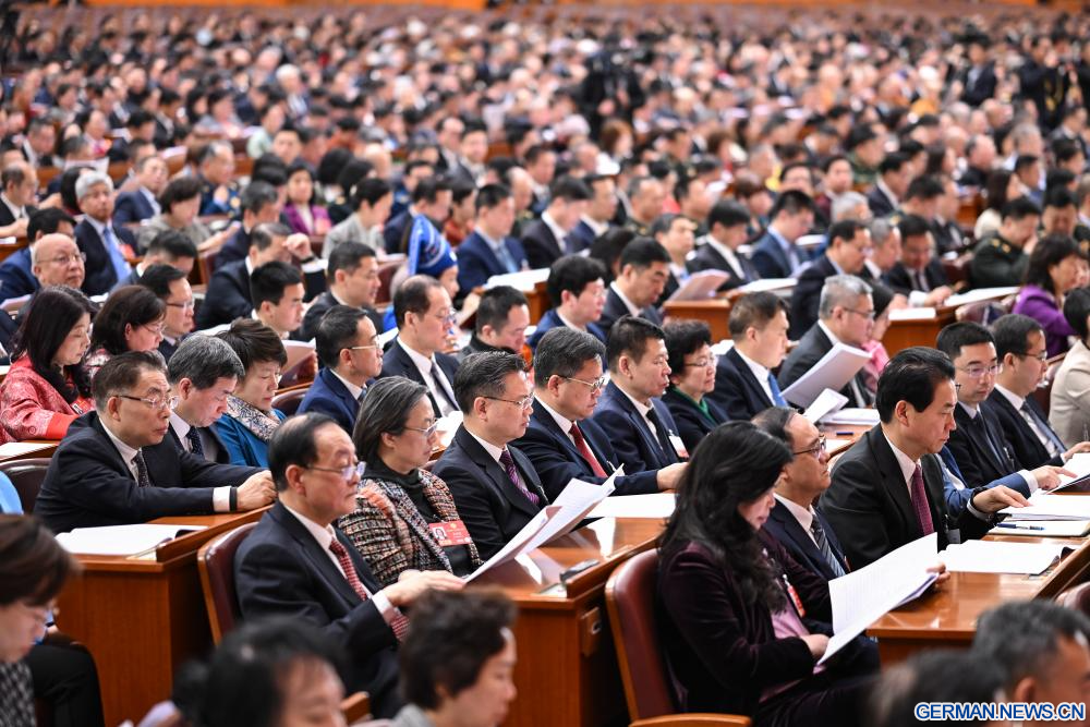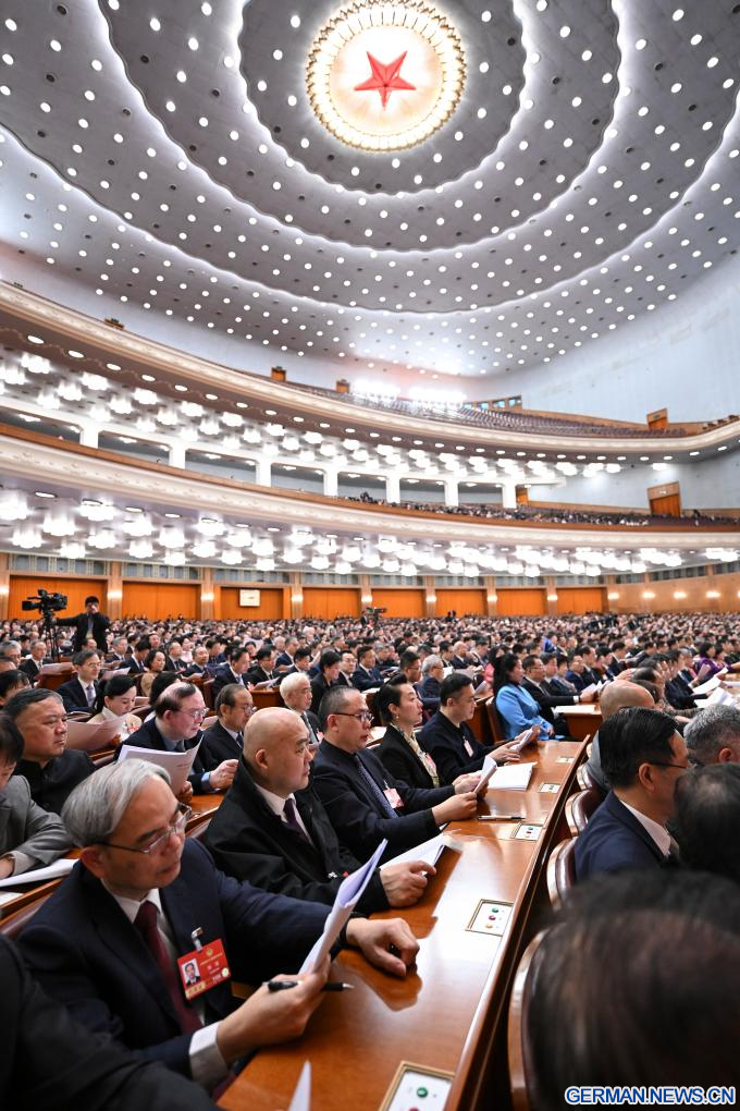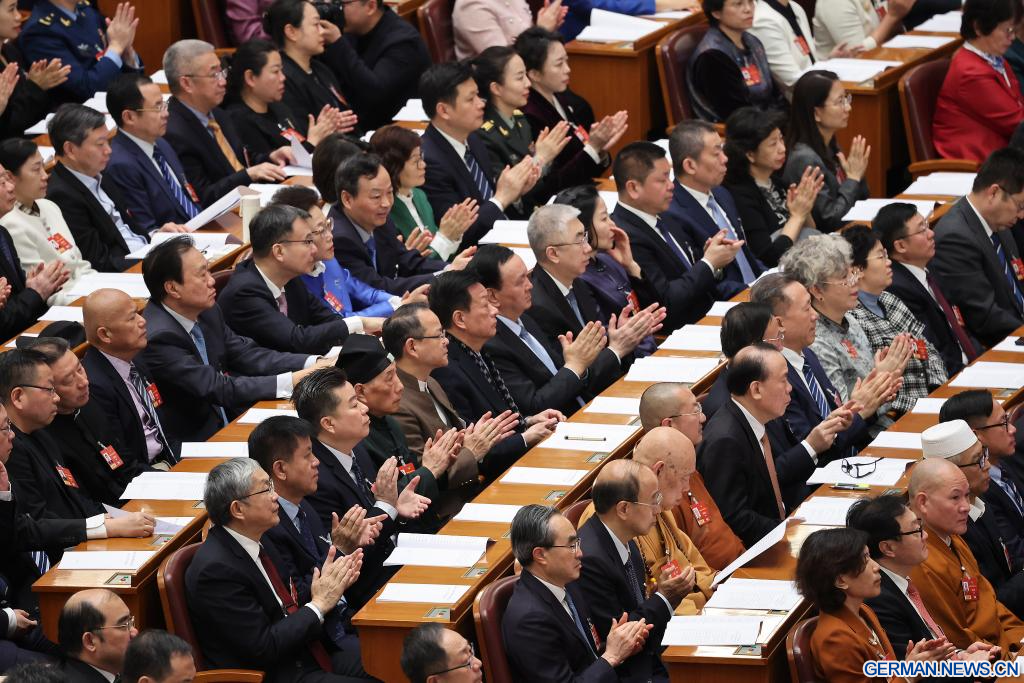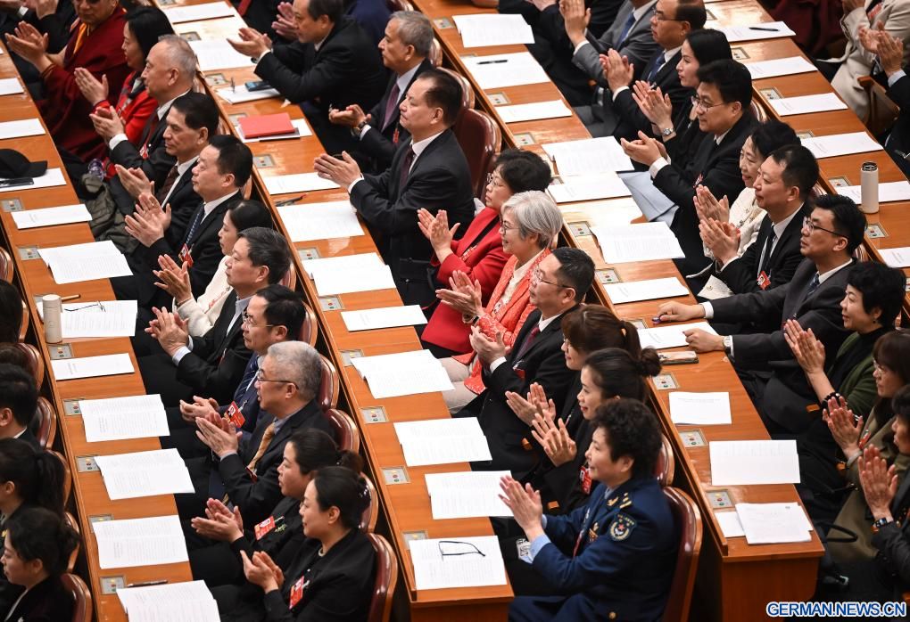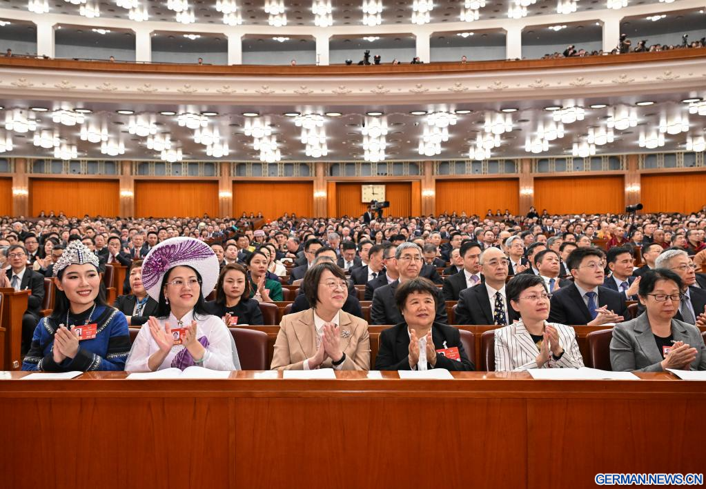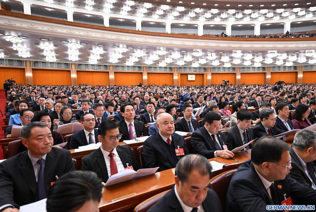 BEIJING, 8. März 2026 (Xinhuanet) -- Die dritte Plenarsitzung der vierten Tagung des 14. Landeskomitees der Politischen Konsultativkonferenz des Chinesischen Volkes (PKKCV) findet in der Großen Halle des Volkes in der chinesischen Hauptstadt Beijing statt, 8. März 2026. (Quelle: Xinhua/Cao Yiming)