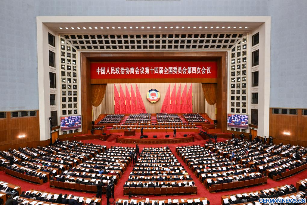 BEIJING, 8. März 2026 (Xinhuanet) -- Die dritte Plenarsitzung der vierten Tagung des 14. Landeskomitees der Politischen Konsultativkonferenz des Chinesischen Volkes (PKKCV) findet in der Großen Halle des Volkes in der chinesischen Hauptstadt Beijing statt, 8. März 2026. (Quelle: Xinhua/Lu Ye)