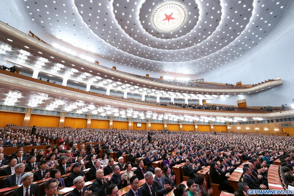 BEIJING, 11. März 2026 (Xinhuanet) -- Die Abschlusssitzung der vierten Tagung des 14. Landeskomitees der Politischen Konsultativkonferenz des Chinesischen Volkes (PKKCV) findet in der Großen Halle des Volkes in Chinas Hauptstadt Beijing statt, 11. März 2026. (Quelle: Xinhua/Shen Hong)