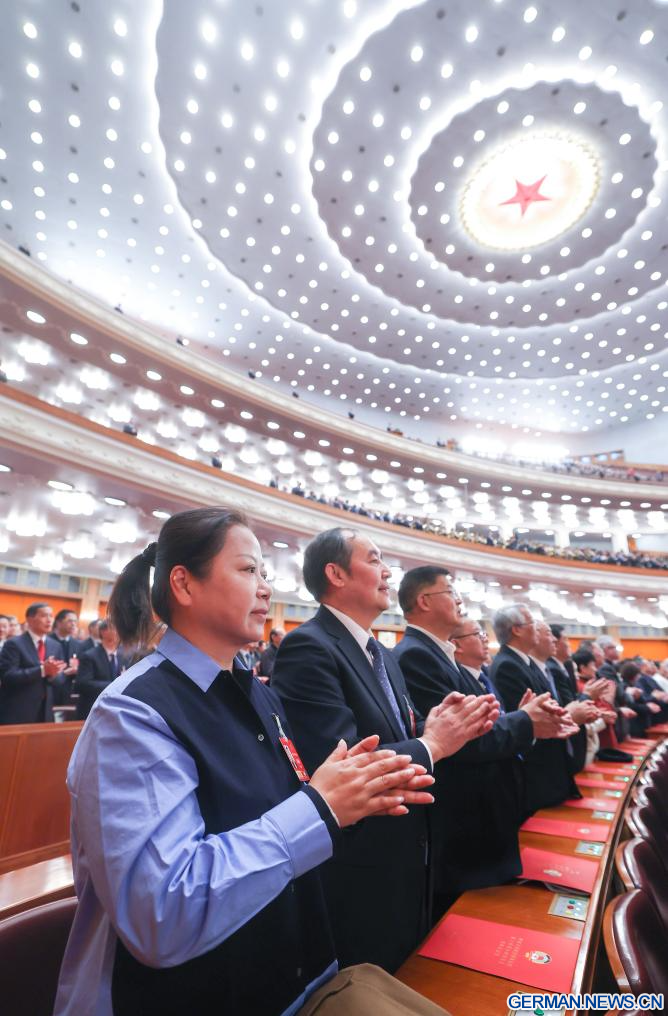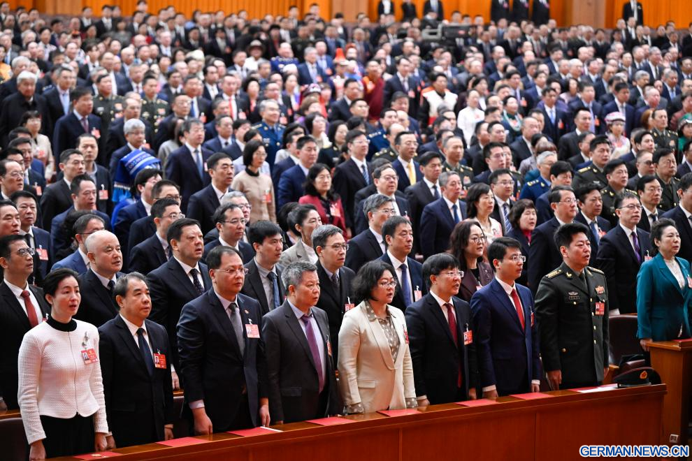 BEIJING, 11. März 2026 (Xinhuanet) -- Die vierte Tagung des 14. Landeskomitees der Politischen Konsultativkonferenz des Chinesischen Volkes (PKKCV) hält ihre Abschlusssitzung in der Großen Halle des Volkes in Chinas Hauptstadt Beijing ab, 11. März 2026. Xi Jinping und andere Führungspersönlichkeiten der Partei und des Staates, darunter Li Qiang, Zhao Leji, Cai Qi, Ding Xuexiang, Li Xi und Han Zheng, nahmen an der Sitzung teil. (Quelle: Xinhua/Yan Yan)