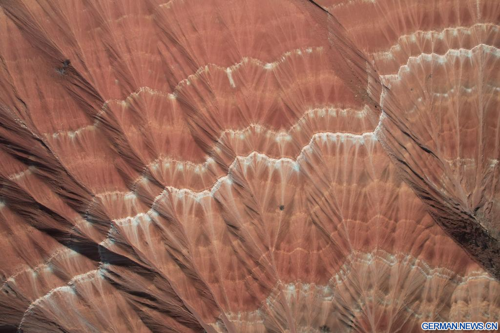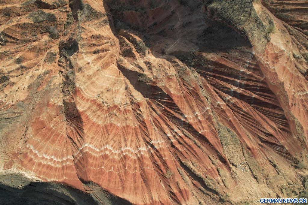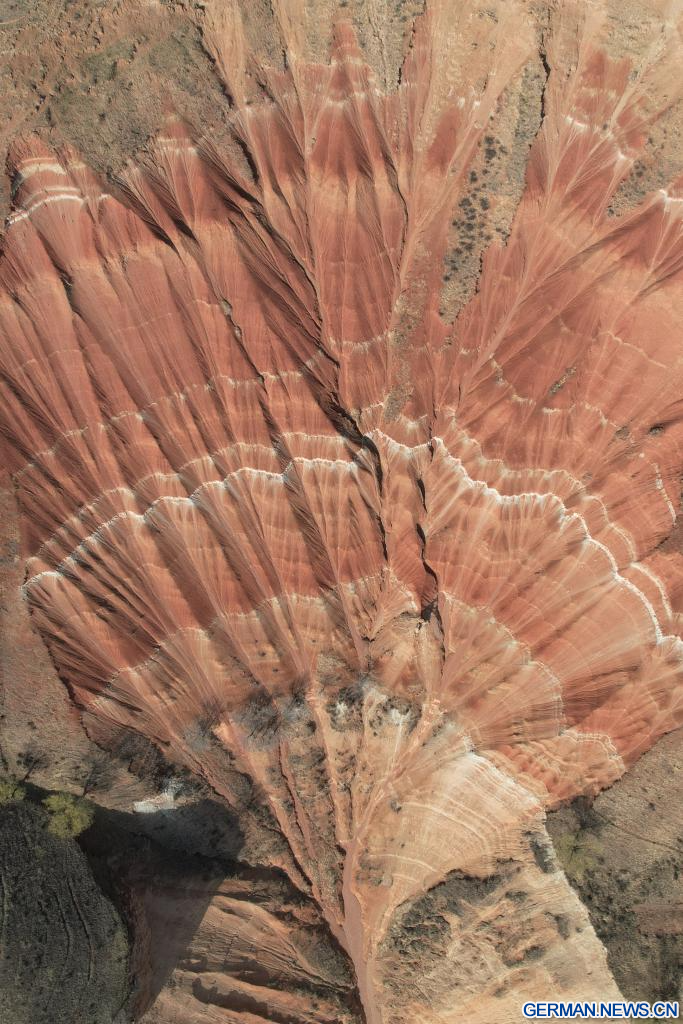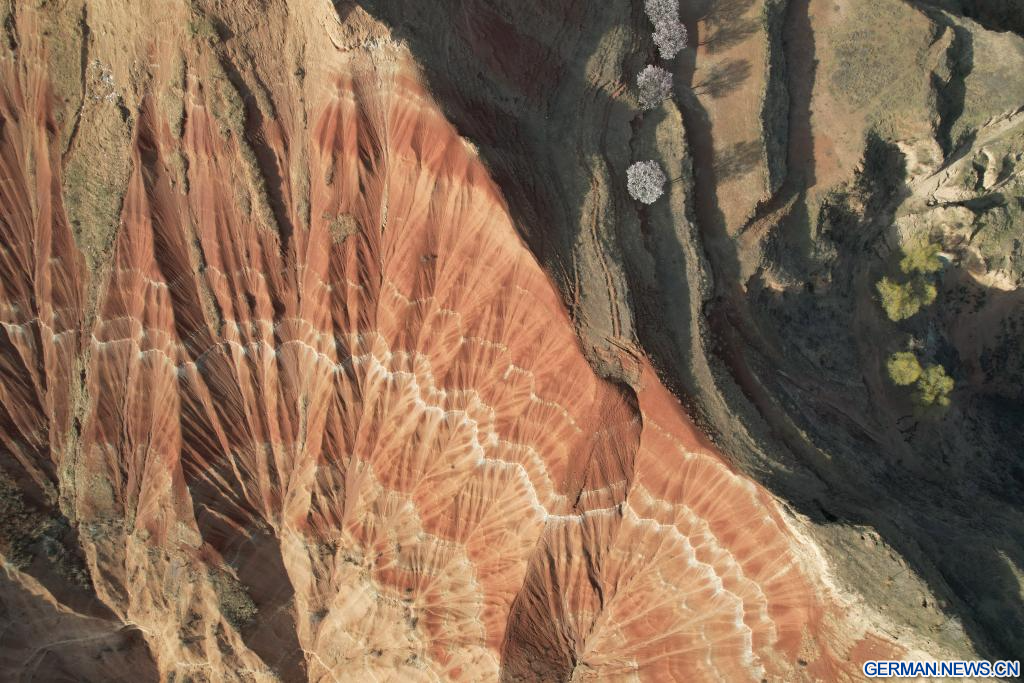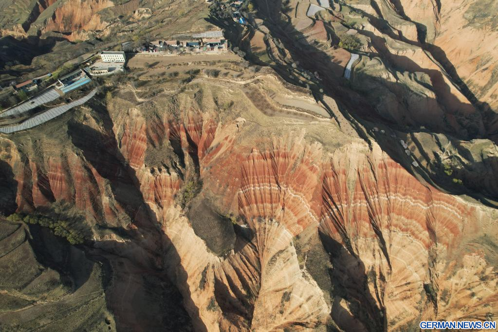 DONGXIANG, 4. April 2026 (Xinhuanet) -- Die Luftaufnahme einer Drohne vom 3. April 2026 zeigt einen Blick auf die Danxia-Landschaft in der Gemeinde Dongyuan im Autonomen Kreis Dongxiang der Autonomen Präfektur Linxia der Hui in der nordwestchinesischen Provinz Gansu. (Quelle: Xinhua/Zhang Zhimin)