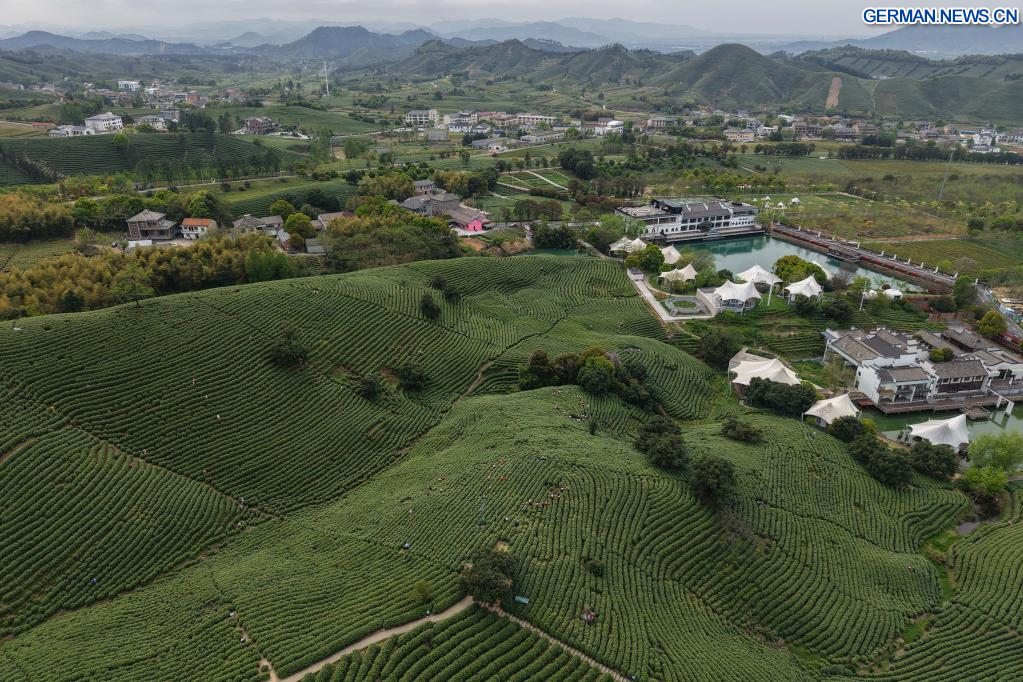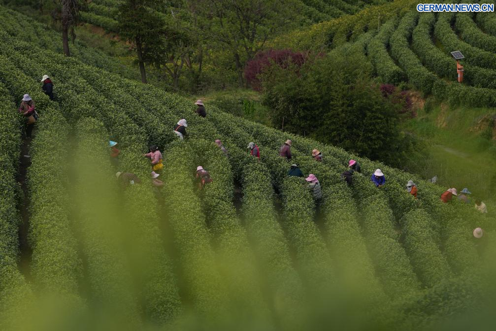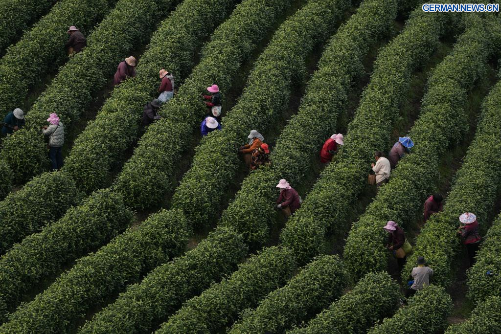 ANJI, 8. April 2026 (Xinhuanet) -- Das am 8. April 2026 aufgenommene Foto zeigt Arbeiter bei der Ernte von Teeblättern in einem Teegarten im Kreis Anji in der ostchinesischen Provinz Zhejiang. Der Weiße Tee im Kreis Anji tritt derzeit in seine Erntesaison ein. Im Jahr 2025 erreichte die Produktion vom Weißen Tee in Anji 2.630 Tonnen, wobei der jährliche Produktionswert der Tee-Industriekette 7 Milliarden Yuan (etwa 1,02 Milliarden US-Dollar) überstieg. Der Kreis verzeichnete im vergangenen Jahr zudem mehr als 5 Millionen Tee-bezogene Touristenbesuche. (Quelle: Xinhua/Huang Zongzhi)