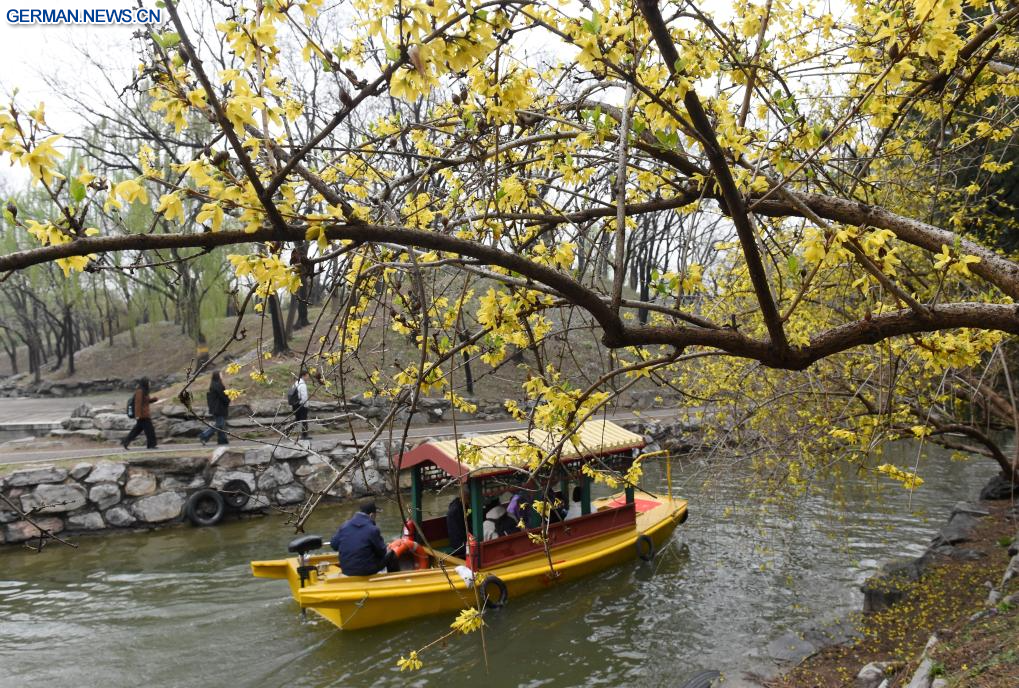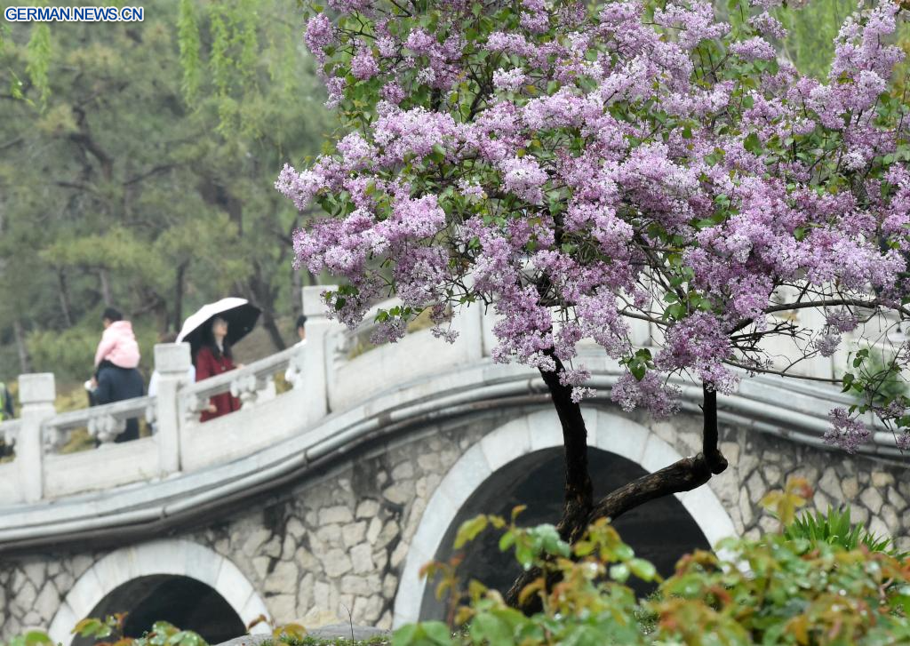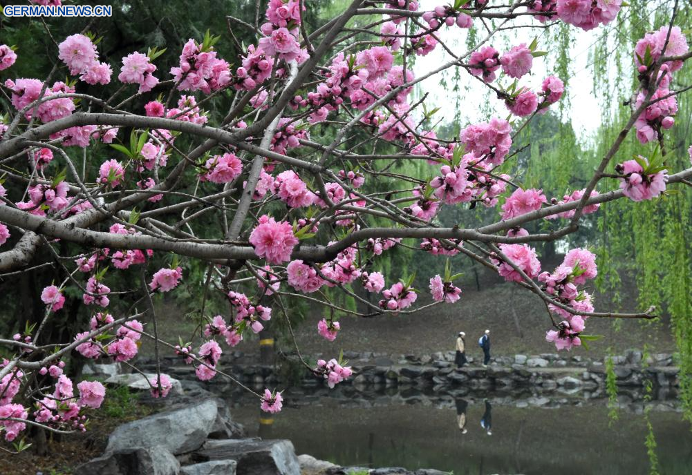 BEIJING, 9. April 2026 (Xinhuanet) -- Touristen besuchen den Yuanmingyuan-Park in Chinas Hauptstadt Beijing, 9. April 2026. Am Donnerstag wurde im Yuanmingyuan-Park ein Frühlingstourismus-Festival eröffnet, das ein immersives Kultur- und Touristenerlebnis bietet. (Quelle: Xinhua/Luo Xiaoguang)