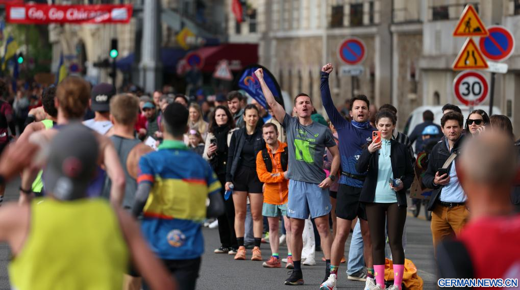 PARIS, 12. April 2026 (Xinhuanet) -- Zuschauer reagieren während des Paris-Marathons 2026 in Paris, Frankreich, 12. April 2026. (Quelle: Xinhua/Wu Huiwo)