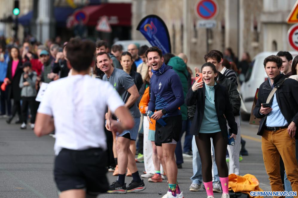 PARIS, 12. April 2026 (Xinhuanet) -- Zuschauer feuern Teilnehmende während des Paris-Marathons 2026 in Paris, Frankreich, an, 12. April 2026. (Quelle: Xinhua/Wu Huiwo)