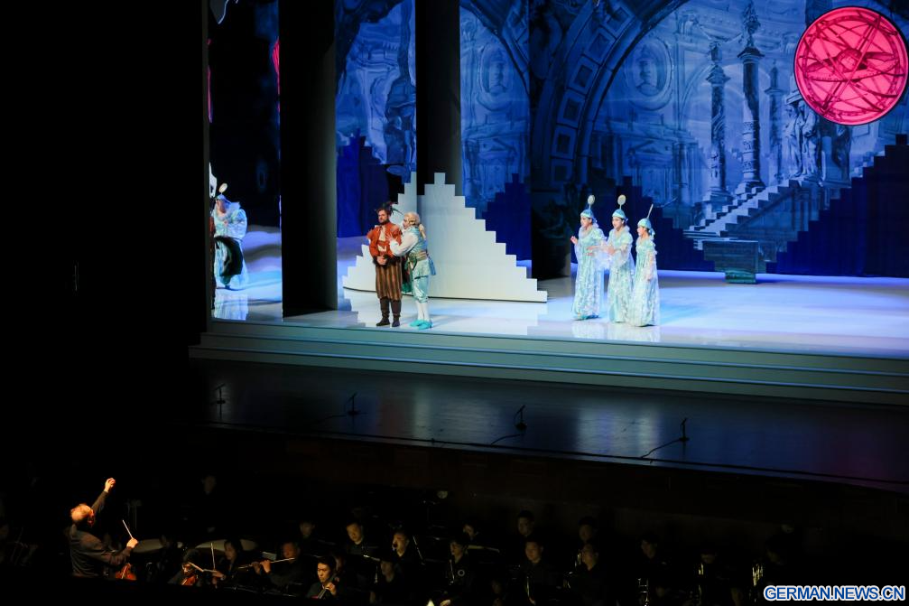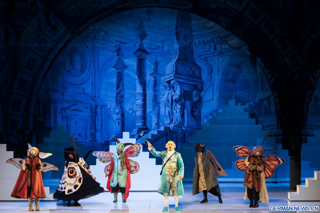 SHANGHAI, 12. April 2026 (Xinhuanet) -- Darsteller führen die Oper „Die Zauberflöte“ des österreichischen Musikers Wolfgang Amadeus Mozart während der Abschlussvorstellung des 41. Internationalen Musikfestivals „Shanghai Spring“ in Shanghai in Ostchina auf, 12. April 2026. (Quelle: Xinhua/Wang Xiang)